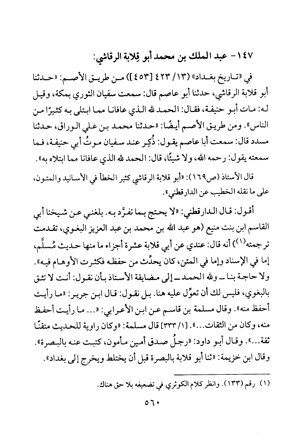 قال الأستاذ (ص ١٦٩): «أبو قلابة الرقاشي كثير الخطأ في الأسانيد والمتون، على ما نقله الخطيب عن الدارقطني».