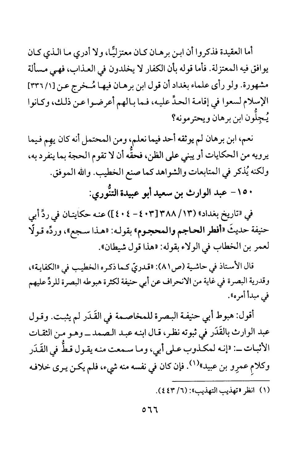 أقول: هبوط أبي حنيفة البصرة للمخاصمة في القَدَر لم يثبت. وقول عبد الوارث بالقَدَر في ثبوته نظر، قال ابنه عبد الصمد ــ وهو من الثقات الأثبات ــ: «إنه لمكذوب على أبي، وما سمعت منه يقول قطُّ في القَدَر وكلامِ عمرِو بن عبيد» (¬١). فإن كان في نفسه منه شيء، فلم يكن يرى خلافه