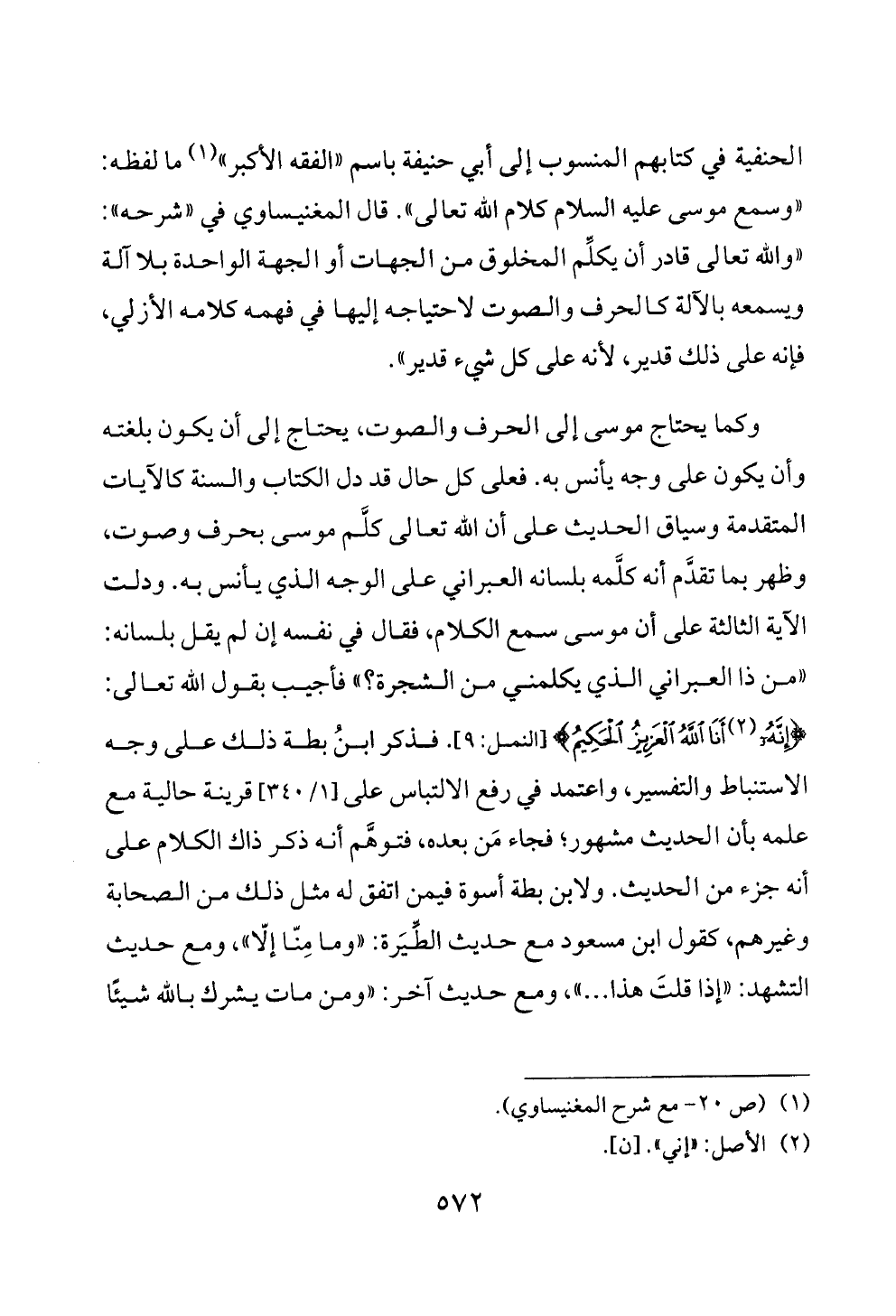 الحنفية في كتابهم المنسوب إلى أبي حنيفة باسم «الفقه الأكبر» (¬١) ما لفظه: «وسمع موسى عليه السلام كلام الله تعالى». قال المغنيساوي في «شرحه»: «والله تعالى قادر أن يكلِّم المخلوق من الجهات أو الجهة الواحدة بلا آلة ويسمعه بالآلة كالحرف والصوت لاحتياجه إليها في فهمه كلامه الأزلي، فإنه على ذلك قدير، لأنه على كل شيء قدير».