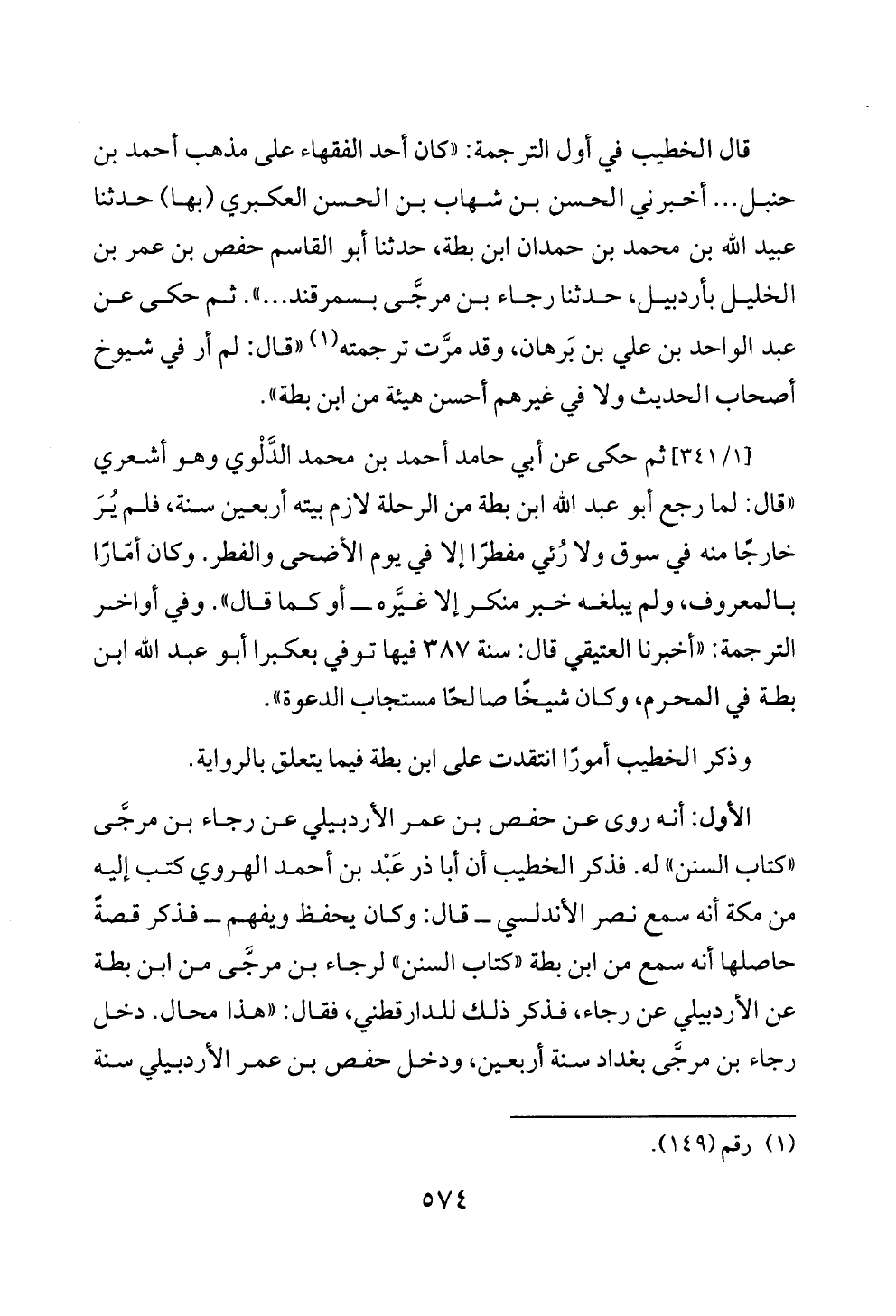 قال الخطيب في أول الترجمة: «كان أحد الفقهاء على مذهب أحمد بن حنبل ... أخبرني الحسن بن شهاب بن الحسن العكبري (بها) حدثنا عبيد الله بن محمد بن حمدان ابن بطة، حدثنا أبو القاسم حفص بن عمر بن الخليل بأردبيل، حدثنا رجاء بن مرجَّى بسمرقند ... ». ثم حكى عن عبد الواحد بن علي بن بَرهان، وقد مرَّت ترجمته (¬١) «قال: لم أر في شيوخ أصحاب الحديث ولا في غيرهم أحسن هيئة من ابن بطة».