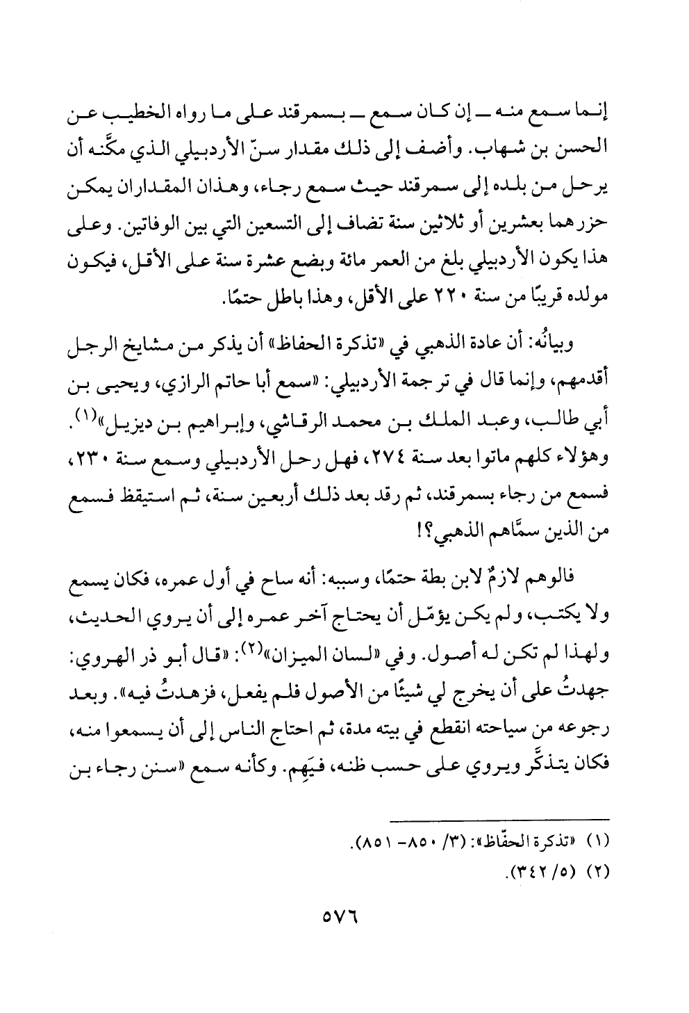 إنما سمع منه ــ إن كان سمع ــ بسمرقند على ما رواه الخطيب عن الحسن بن شهاب. وأضف إلى ذلك مقدار سنّ الأردبيلي الذي مكَّنه أن يرحل من بلده إلى سمرقند حيث سمع رجاء، وهذان المقداران يمكن حزرهما بعشرين أو ثلاثين سنة تضاف إلى التسعين التي بين الوفاتين. وعلى هذا يكون الأردبيلي بلغ من العمر مائة وبضع عشرة سنة على الأقل، فيكون مولده قريبًا من سنة ٢٢٠ على الأقل، وهذا باطل حتمًا.