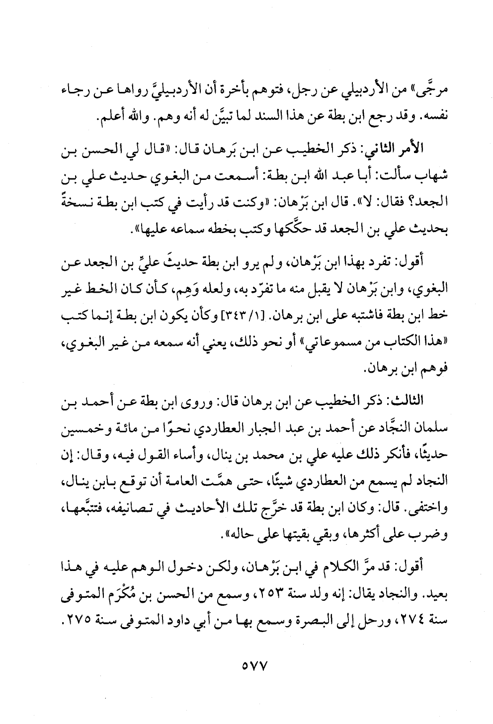 الثالث: ذكر الخطيب عن ابن برهان قال: وروى ابن بطة عن أحمد بن سلمان النجَّاد عن أحمد بن عبد الجبار العطاردي نحوًا من مائة وخمسين حديثًا، فأنكر ذلك عليه علي بن محمد بن ينال، وأساء القول فيه، وقال: إن النجاد لم يسمع من العطاردي شيئًا، حتى همَّت العامة أن توقع بابن ينال، واختفى. قال: وكان ابن بطة قد خرَّج تلك الأحاديث في تصانيفه، فتتبَّعها، وضرب على أكثرها، وبقي بقيتها على حاله».