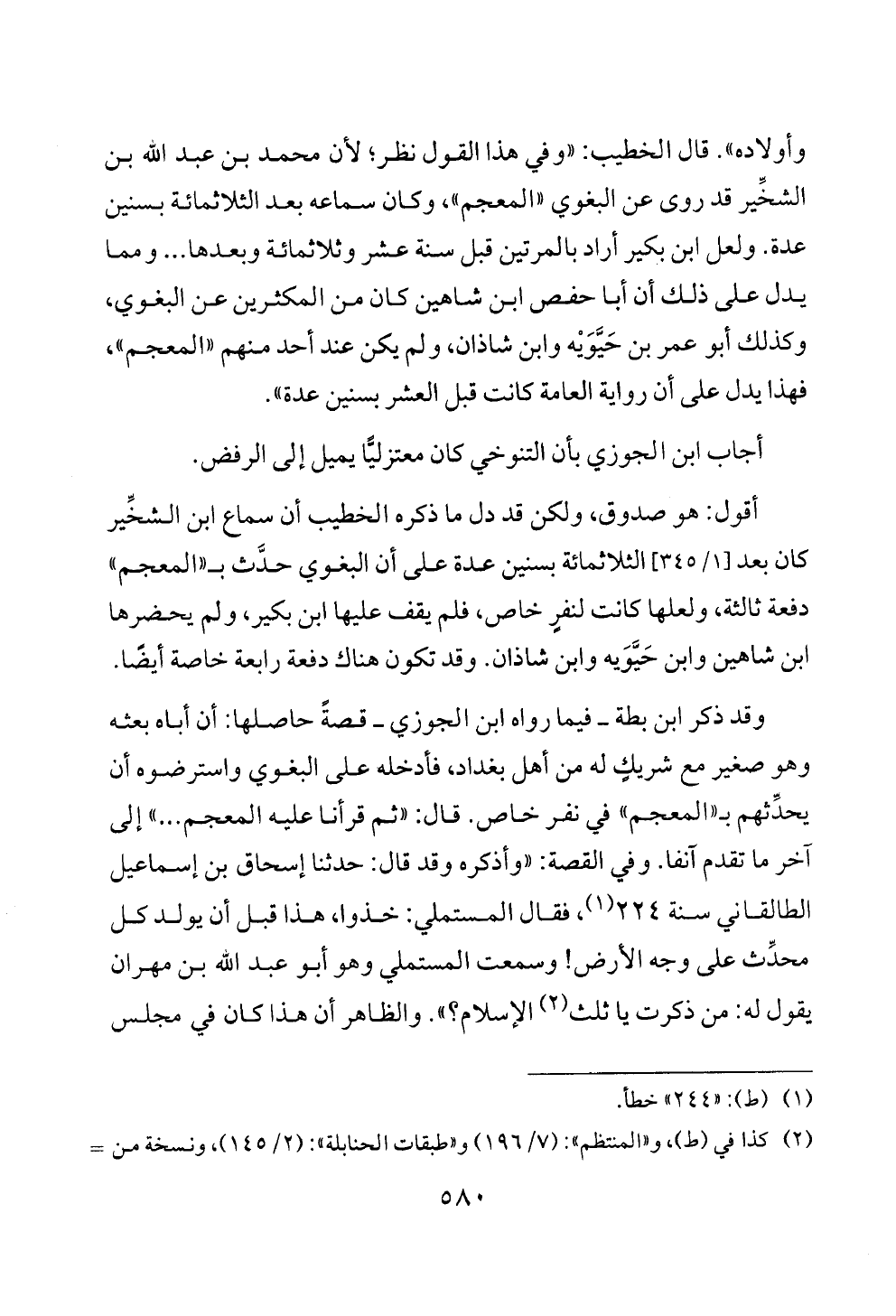 أقول: هو صدوق، ولكن قد دل ما ذكره الخطيب أن سماع ابن الشخِّير كان بعد [١/ ٣٤٥] الثلاثمائة بسنين عدة على أن البغوي حدَّث بـ «المعجم» دفعة ثالثة، ولعلها كانت لنفرٍ خاص، فلم يقف عليها ابن بكير، ولم يحضرها ابن شاهين وابن حَيَّوَيه وابن شاذان. وقد تكون هناك دفعة رابعة خاصة أيضًا.