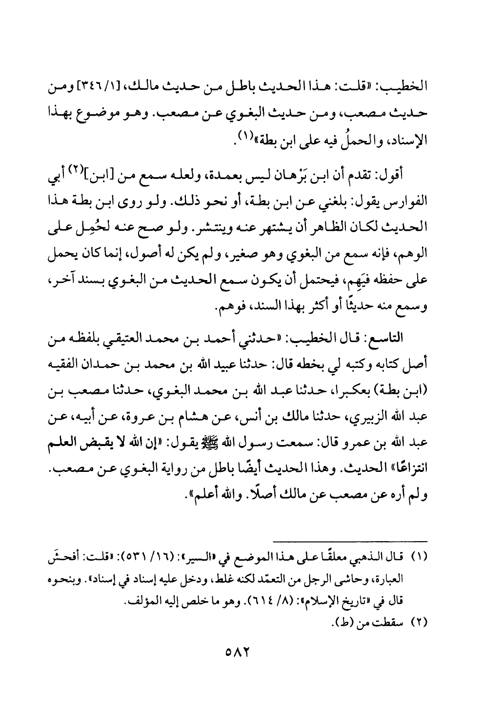 التاسع: قال الخطيب: «حدثني أحمد بن محمد العتيقي بلفظه من أصل كتابه وكتبه لي بخطه قال: حدثنا عبيد الله بن محمد بن حمدان الفقيه (ابن بطة) بعكبرا، حدثنا عبد الله بن محمد البغوي، حدثنا مصعب بن عبد الله الزبيري، حدثنا مالك بن أنس، عن هشام بن عروة، عن أبيه، عن عبد الله بن عمرو قال: سمعت رسول الله - صلى الله عليه وسلم - يقول: «إن الله لا يقبض العلم انتزاعًا» الحديث. وهذا الحديث أيضًا باطل من رواية البغوي عن مصعب. ولم أره عن مصعب عن مالك أصلًا. والله أعلم».