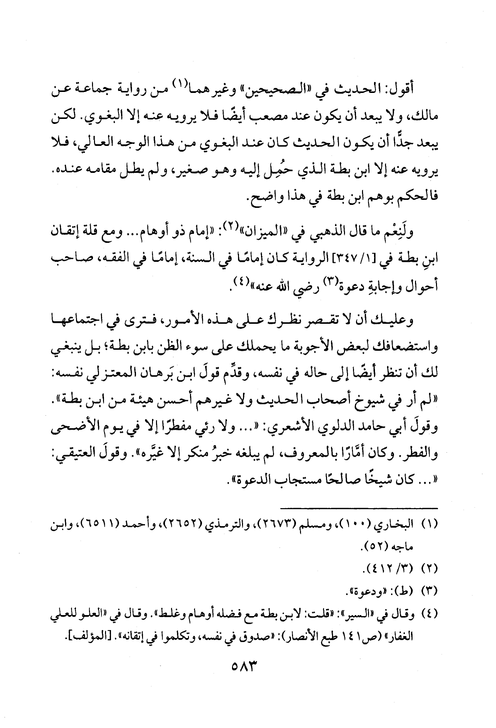 (¬٤) وقال في «السير»: «قلت: لابن بطة مع فضله أوهام وغلط». وقال في «العلو للعلي الغفار» (ص ١٤١ طبع الأنصار): «صدوق في نفسه، وتكلموا في إتقانه». [المؤلف].