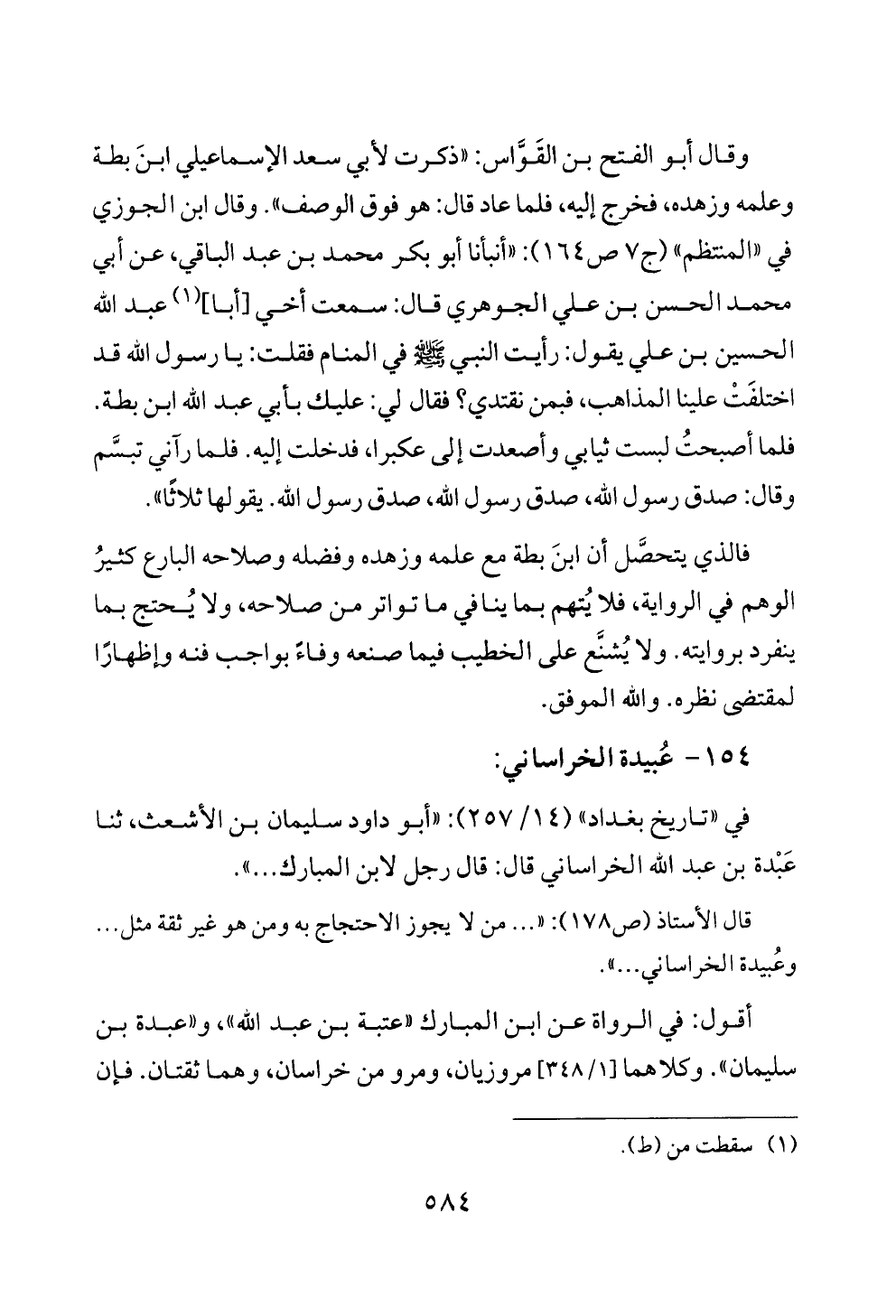 أقول: في الرواة عن ابن المبارك «عتبة بن عبد الله»، و «عبدة بن سليمان». وكلاهما [١/ ٣٤٨] مروزيان، ومرو من خراسان، وهما ثقتان. فإن