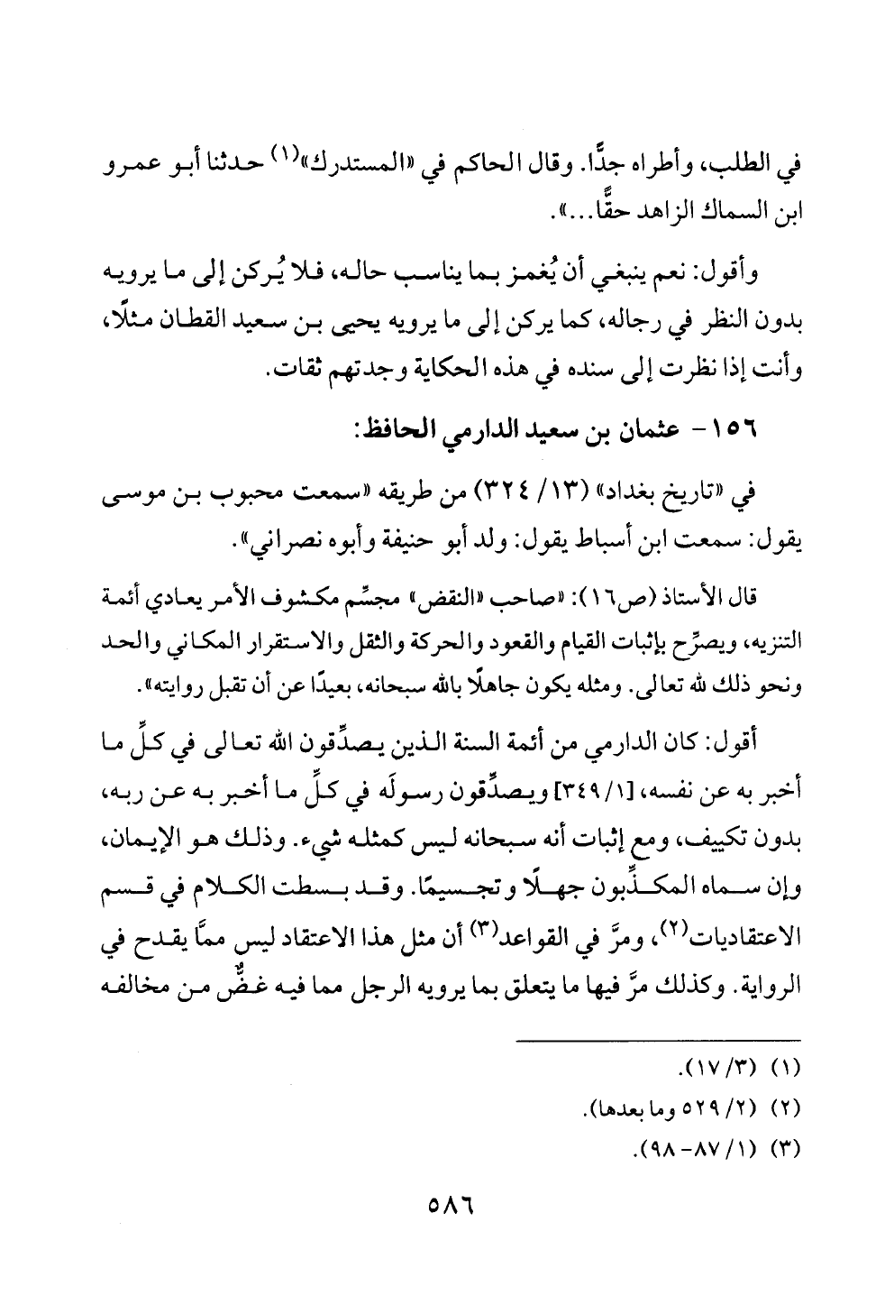 أقول: كان الدارمي من أئمة السنة الذين يصدِّقون الله تعالى في كلِّ ما أخبر به عن نفسه، [١/ ٣٤٩] ويصدِّقون رسولَه في كلِّ ما أخبر به عن ربه، بدون تكييف، ومع إثبات أنه سبحانه ليس كمثله شيء. وذلك هو الإيمان، وإن سماه المكذِّبون جهلًا وتجسيمًا. وقد بسطت الكلام في قسم الاعتقاديات (¬٢)، ومرَّ في القواعد (¬٣) أن مثل هذا الاعتقاد ليس ممَّا يقدح في الرواية. وكذلك مرَّ فيها ما يتعلق بما يرويه الرجل مما فيه غضٌّ من مخالفه