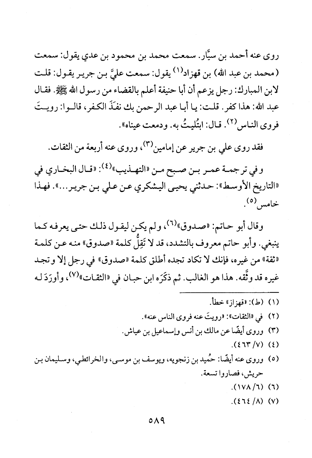 روى عنه أحمد بن سيَّار. سمعت محمد بن محمود بن عدي يقول: سمعت (محمد بن عبد الله) بن قهزاد (¬١) يقول: سمعت عليَّ بن جرير يقول: قلت لابن المبارك: رجل يزعم أن أبا حنيفة أعلم بالقضاء من رسول الله - صلى الله عليه وسلم -. فقال عبد الله: هذا كفر. قلت: يا أبا عبد الرحمن بك نفَذَ الكفر، قالوا: رويتَ فروى الناس (¬٢). قال: ابتُليتُ به. ودمعت عيناه».