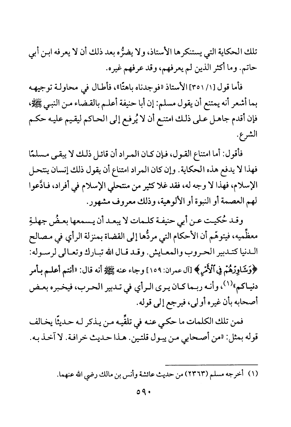 فأما قول [١/ ٣٥١] الأستاذ «فوجدناه باهتًا»، فأطال في محاولة توجيهه بما أشعر أنه يمتنع أن يقول مسلم: إن أبا حنيفة أعلم بالقضاء من النبي - صلى الله عليه وسلم -، فإن أقدم جاهل على ذلك امتنع أن لا يُرفع إلى الحاكم ليقيم عليه حكم الشرع.
