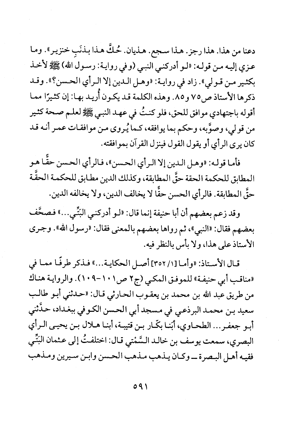 دعنا من هذا. هذا رجز. هذا سجع. هذيان. حُكَّ هذا بذنَبِ خنزير». وما عزي إليه من قوله: «لو أدركني النبي (وفي رواية: رسول الله) - صلى الله عليه وسلم - لأخذ بكثير من قولي». زاد في رواية: «وهل الدين إلا الرأي الحسن؟». وقد ذكرها الأستاذ ص ٧٥ و ٨٥. وهذه الكلمة قد يكون أُريد بها: إن كثيرًا مما أقوله باجتهادي موافق للحق، فلو كنتُ في عهد النبي - صلى الله عليه وسلم - لعلم صحة كثير من قولي، وصوَّبه، وحكم بما يوافقه، كما يُروى من موافقات عمر أنه قد كان يرى الرأي أو يقول القول فينزل القرآن بموافقته.
