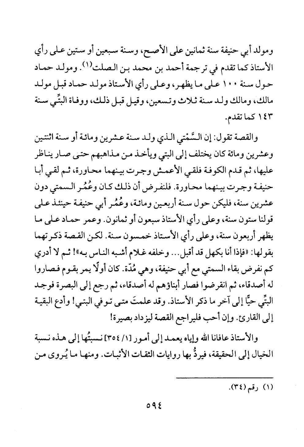 والقصة تقول: إن السَّمْتي الذي ولد سنة عشرين ومائة أو سنة اثنتين وعشرين ومائة كان يختلف إلى البتي ويأخذ من مذاهبهم حتى صار يناظر عليها، ثم قدم الكوفة فلقي الأعمش وجرت بينهما محاورة، ثم لقي أبا حنيفة وجرت بينهما محاورة. فلنفرض أن ذلك كان وعُمُر السمتي دون عشرين سنة، فليكن حول سنة أربعين ومائة، وعُمُر أبي حنيفة حينئذ على قولنا ستون سنة، وعلى رأي الأستاذ سبعون أو ثمانون. وعمر حماد على ما يظهر أربعون سنة، وعلى رأي الأستاذ خمسون سنة. لكن القصة ذكرتهما بقولها: «فإذا أنا بكهل قد أقبل ... وخلفه غلام أشبه الناس به»! ثم لا أدري كم نفرض بقاء السمتي مع أبي حنيفة، وهي مُدّة. كان أولًا يمر بقوم فصاروا له أصدقاء، ثم انقرضوا فصار أبناؤهم له أصدقاء، ثم رجع إلى البصرة فوجد البتِّي حيًّا إلى آخر ما ذكر الأستاذ. وقد علمتَ متى توفي البتي! وأدع البقية إلى القارئ. وإن أحب فليراجع القصة ليزداد بصيرة!
