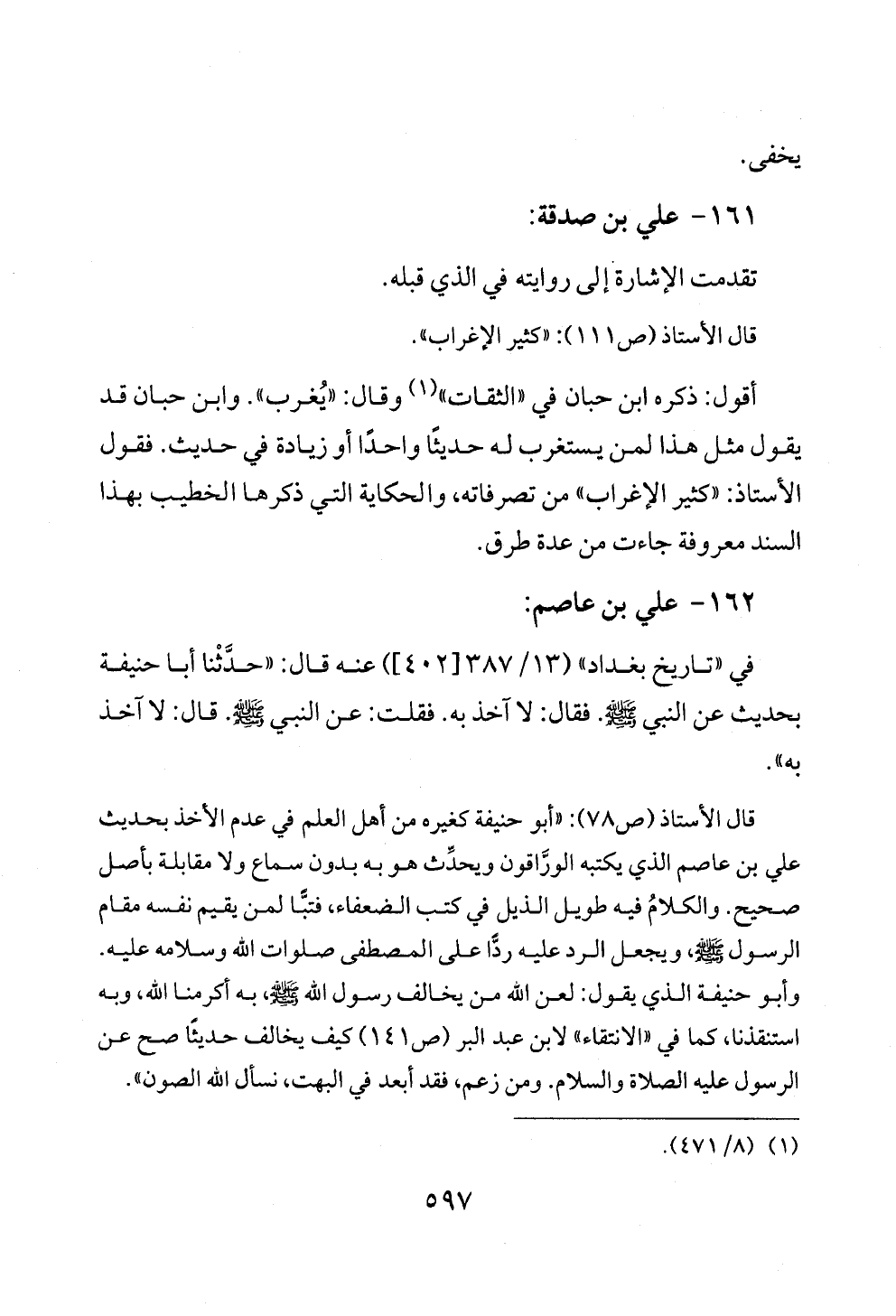 قال الأستاذ (ص ٧٨): «أبو حنيفة كغيره من أهل العلم في عدم الأخذ بحديث علي بن عاصم الذي يكتبه الورَّاقون ويحدِّث هو به بدون سماع ولا مقابلة بأصل صحيح. والكلامُ فيه طويل الذيل في كتب الضعفاء، فتبًّا لمن يقيم نفسه مقام الرسول - صلى الله عليه وسلم -، ويجعل الرد عليه ردًّا على المصطفى صلوات الله وسلامه عليه. وأبو حنيفة الذي يقول: لعن الله من يخالف رسول الله - صلى الله عليه وسلم -، به أكرمنا الله، وبه استنقذنا، كما في «الانتقاء» لابن عبد البر (ص ١٤١) كيف يخالف حديثًا صح عن الرسول عليه الصلاة والسلام. ومن زعم، فقد أبعد في البهت، نسأل الله الصون».