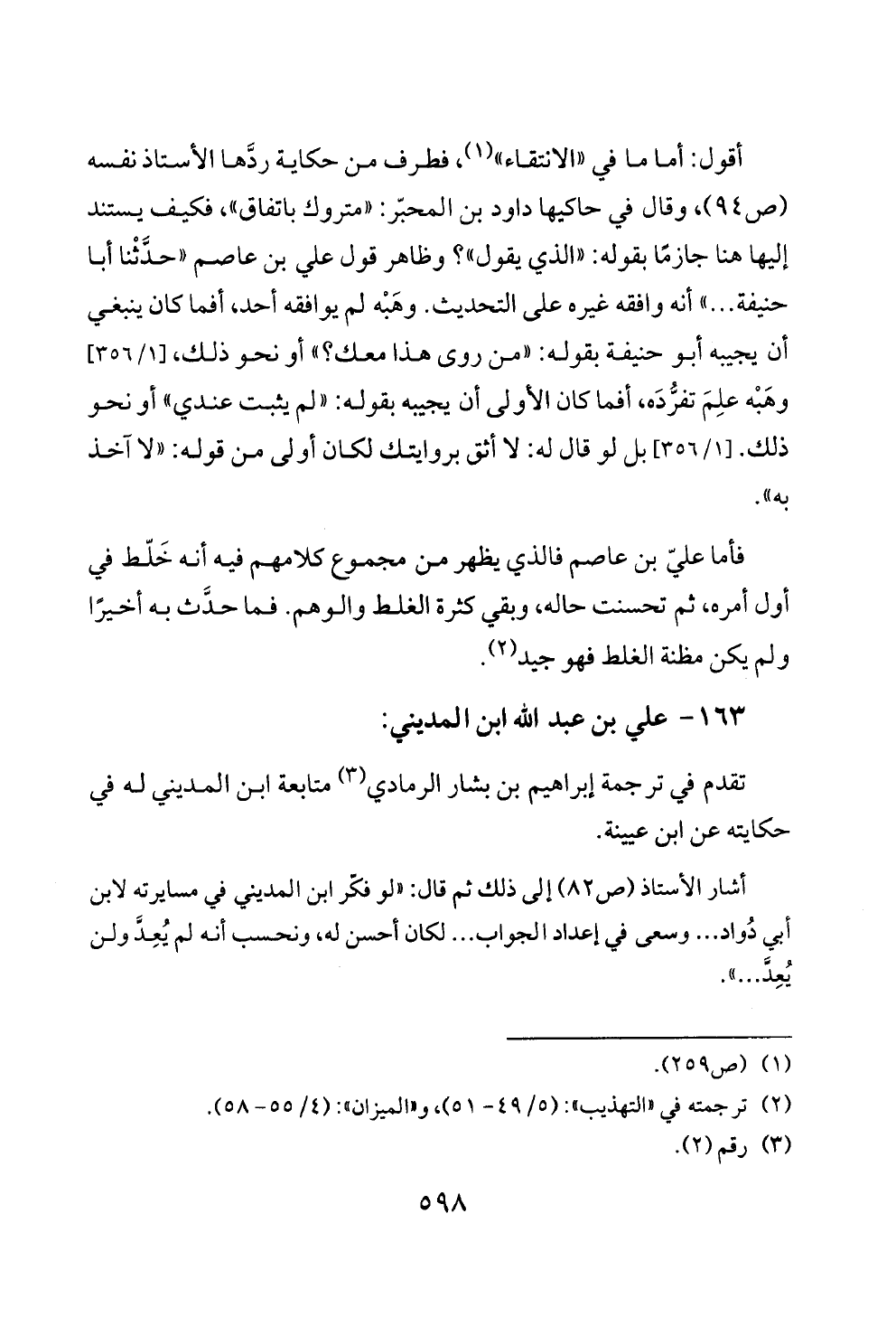 أقول: أما ما في «الانتقاء» (¬١)، فطرف من حكاية ردَّها الأستاذ نفسه (ص ٩٤)، وقال في حاكيها داود بن المحبّر: «متروك باتفاق»، فكيف يستند إليها هنا جازمًا بقوله: «الذي يقول»؟ وظاهر قول علي بن عاصم «حدَّثْنا أبا حنيفة ... » أنه وافقه غيره على التحديث. وهَبْه لم يوافقه أحد، أفما كان ينبغي أن يجيبه أبو حنيفة بقوله: «من روى هذا معك؟» أو نحو ذلك، [١/ ٣٥٦] وهَبْه علِمَ تفرُّدَه، أفما كان الأولى أن يجيبه بقوله: «لم يثبت عندي» أو نحو ذلك. [١/ ٣٥٦] بل لو قال له: لا أثق بروايتك لكان أولى من قوله: «لا آخذ به».