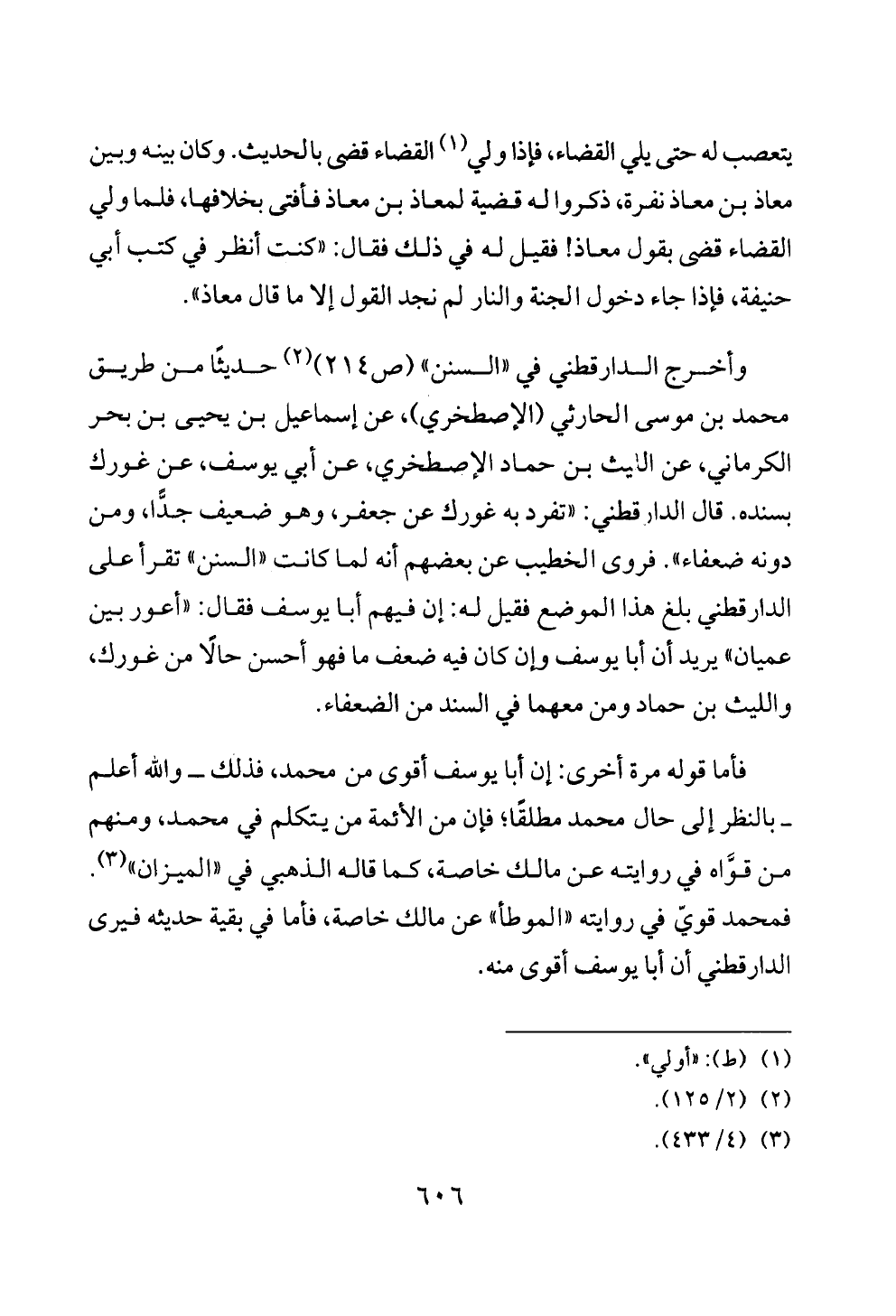 فأما قوله مرة أخرى: إن أبا يوسف أقوى من محمد، فذلك ــ والله أعلم ــ بالنظر إلى حال محمد مطلقًا؛ فإن من الأئمة من يتكلم في محمد، ومنهم من قوَّاه في روايته عن مالك خاصة، كما قاله الذهبي في «الميزان» (¬٣). فمحمد قويّ في روايته «الموطأ» عن مالك خاصة، فأما في بقية حديثه فيرى الدارقطني أن أبا يوسف أقوى منه.