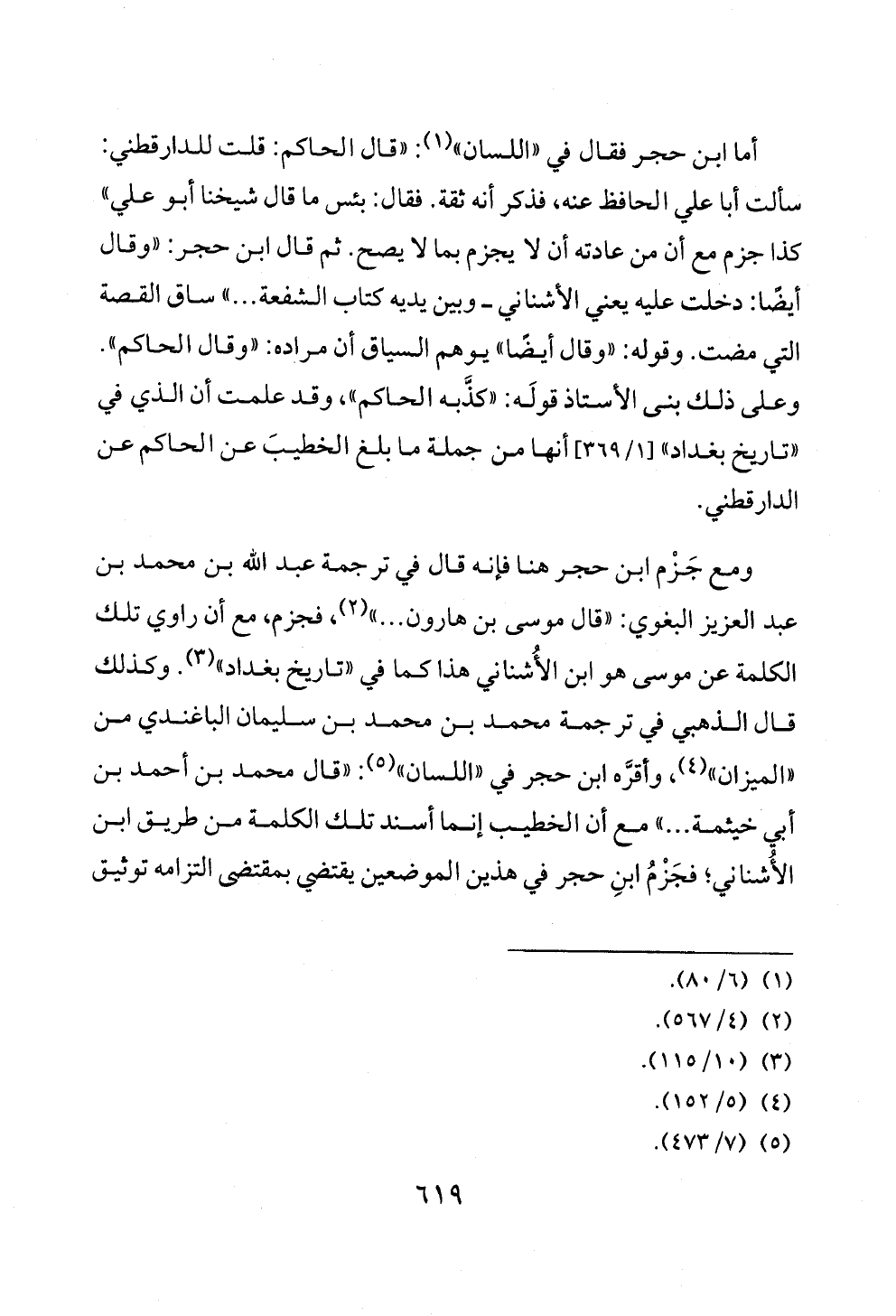 أما ابن حجر فقال في «اللسان» (¬١): «قال الحاكم: قلت للدارقطني: سألت أبا علي الحافظ عنه، فذكر أنه ثقة. فقال: بئس ما قال شيخنا أبو علي» كذا جزم مع أن من عادته أن لا يجزم بما لا يصح. ثم قال ابن حجر: «وقال أيضًا: دخلت عليه يعني الأشناني ــ وبين يديه كتاب الشفعة ... » ساق القصة التي مضت. وقوله: «وقال أيضًا» يوهم السياق أن مراده: «وقال الحاكم». وعلى ذلك بنى الأستاذ قولَه: «كذَّبه الحاكم»، وقد علمت أن الذي في «تاريخ بغداد» [١/ ٣٦٩] أنها من جملة ما بلغ الخطيبَ عن الحاكم عن الدارقطني.