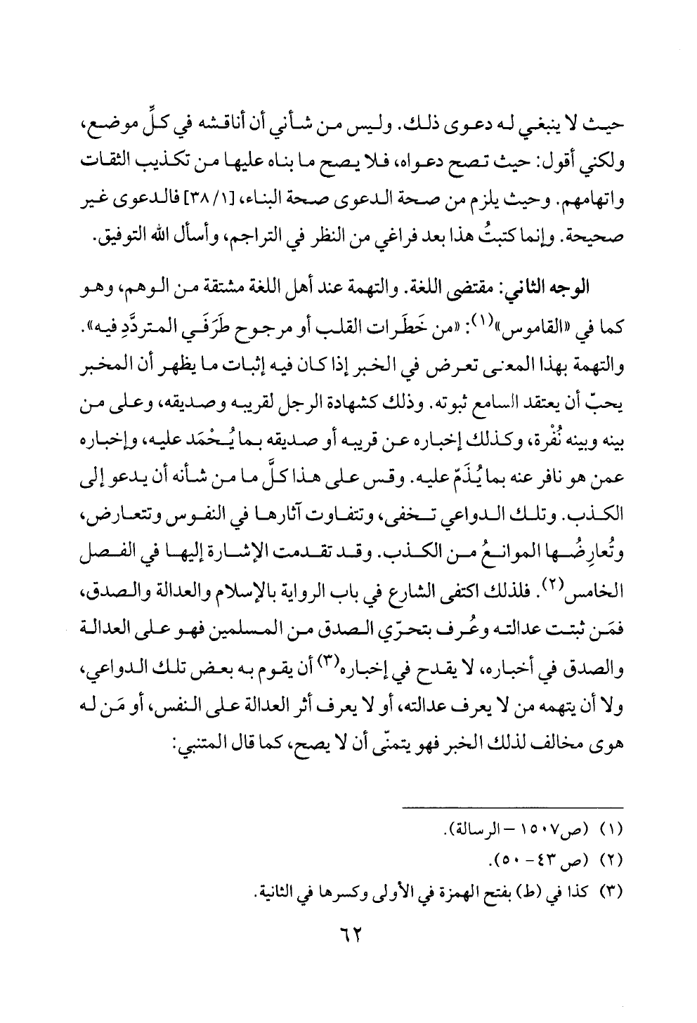 الوجه الثاني: مقتضى اللغة. والتهمة عند أهل اللغة مشتقة من الوهم، وهو كما في "القاموس" (¬١): "من خَطَرات القلب أو مرجوح طَرَفَي المتردَّدِ فيه". والتهمة بهذا المعنى تعرض في الخبر إذا كان فيه إثبات ما يظهر أن المخبر يحبّ أن يعتقد السامع ثبوته. وذلك كشهادة الرجل لقريبه وصديقه، وعلى من بينه وبينه نُفْرة، وكذلك إخباره عن قريبه أو صديقه بما يُحْمَد عليه، وإخباره عمن هو نافر عنه بما يُذَمّ عليه. وقس على هذا كلَّ ما من شأنه أن يدعو إلى الكذب. وتلك الدواعي تخفى، وتتفاوت آثارها في النفوس وتتعارض، وتُعارِضُها الموانعُ من الكذب. وقد تقدمت الإشارة إليها في الفصل الخامس (¬٢). فلذلك اكتفى الشارع في باب الرواية بالإسلام والعدالة والصدق، فمَن ثبتت عدالته وعُرف بتحرّي الصدق من المسلمين فهو على العدالة والصدق في أخباره، لا يقدح في إخباره (¬٣) أن يقوم به بعض تلك الدواعي، ولا أن يتهمه من لا يعرف عدالته، أو لا يعرف أثر العدالة على النفس، أو مَن له هوى مخالف لذلك الخبر فهو يتمنّى أن لا يصح، كما قال المتنبي: