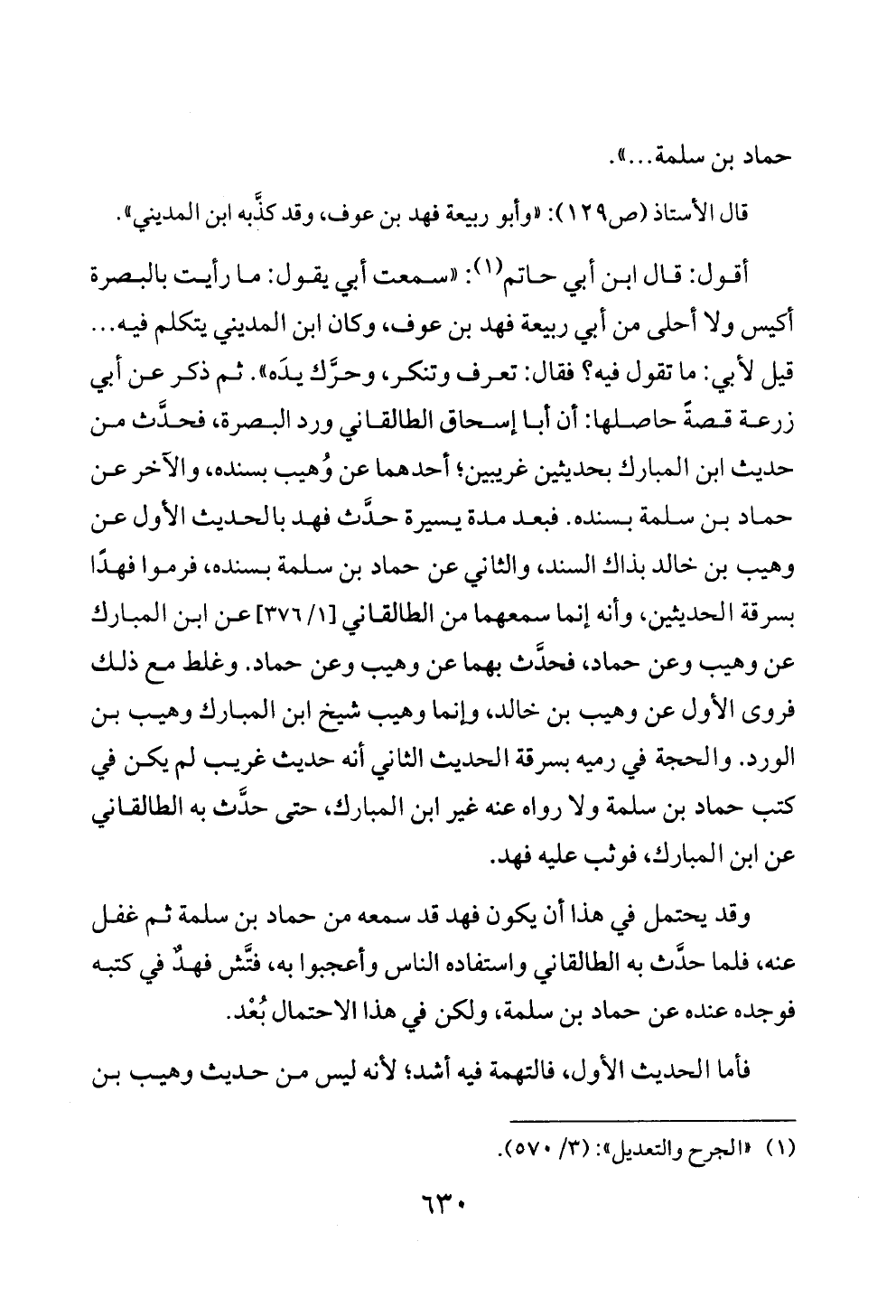 أقول: قال ابن أبي حاتم (¬١): «سمعت أبي يقول: ما رأيت بالبصرة أكيس ولا أحلى من أبي ربيعة فهد بن عوف، وكان ابن المديني يتكلم فيه ... قيل لأبي: ما تقول فيه؟ فقال: تعرف وتنكر، وحرَّك يدَه». ثم ذكر عن أبي زرعة قصةً حاصلها: أن أبا إسحاق الطالقاني ورد البصرة، فحدَّث من حديث ابن المبارك بحديثين غريبين؛ أحدهما عن وُهيب بسنده، والآخر عن حماد بن سلمة بسنده. فبعد مدة يسيرة حدَّث فهد بالحديث الأول عن وهيب بن خالد بذاك السند، والثاني عن حماد بن سلمة بسنده، فرموا فهدًا بسرقة الحديثين، وأنه إنما سمعهما من الطالقاني [١/ ٣٧٦] عن ابن المبارك عن وهيب وعن حماد، فحدَّث بهما عن وهيب وعن حماد. وغلط مع ذلك فروى الأول عن وهيب بن خالد، وإنما وهيب شيخ ابن المبارك وهيب بن الورد. والحجة في رميه بسرقة الحديث الثاني أنه حديث غريب لم يكن في كتب حماد بن سلمة ولا رواه عنه غير ابن المبارك، حتى حدَّث به الطالقاني عن ابن المبارك، فوثب عليه فهد.
