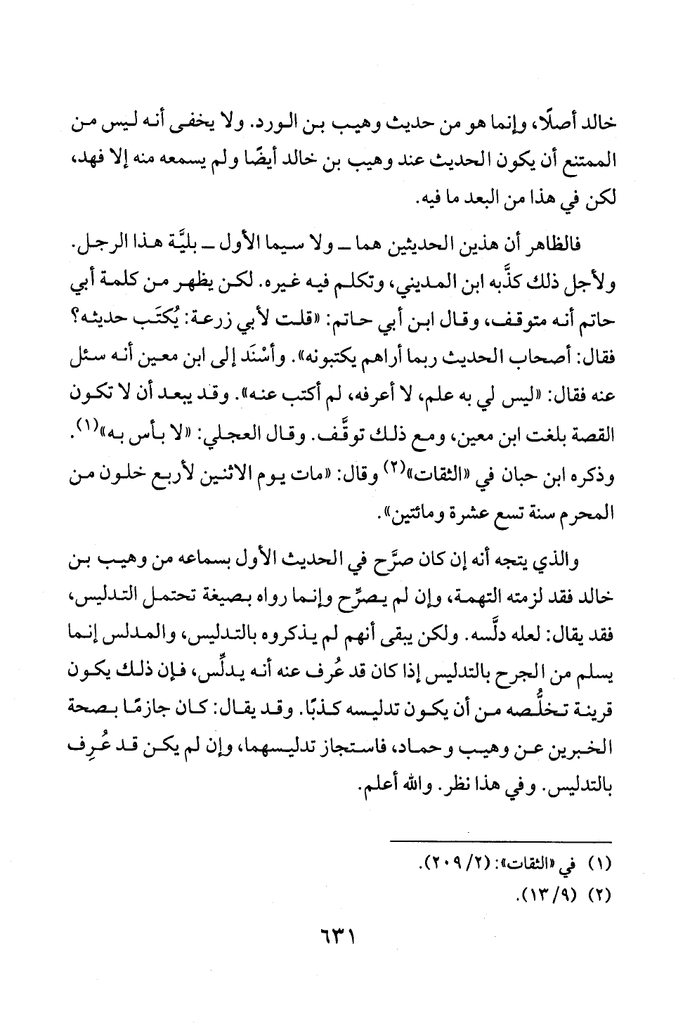 والذي يتجه أنه إن كان صرَّح في الحديث الأول بسماعه من وهيب بن خالد فقد لزمته التهمة، وإن لم يصرِّح وإنما رواه بصيغة تحتمل التدليس، فقد يقال: لعله دلَّسه. ولكن يبقى أنهم لم يذكروه بالتدليس، والمدلس إنما يسلم من الجرح بالتدليس إذا كان قد عُرف عنه أنه يدلِّس، فإن ذلك يكون قرينة تخلُّصه من أن يكون تدليسه كذبًا. وقد يقال: كان جازمًا بصحة الخبرين عن وهيب وحماد، فاستجاز تدليسهما، وإن لم يكن قد عُرِف بالتدليس. وفي هذا نظر. والله أعلم.