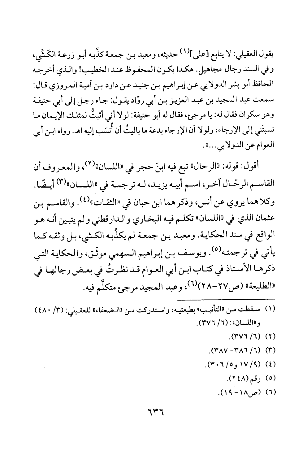 أقول: قوله: «الرحال» تبع فيه ابنَ حجر في «اللسان» (¬٢)، والمعروف أن القاسم الرحّال آخر، اسم أبيه يزيد، له ترجمة في «اللسان» (¬٣) أيضًا. وكلاهما يروي عن أنس، وذكرهما ابن حبان في «الثقات» (¬٤). والقاسم بن عثمان الذي في «اللسان» تكلم فيه البخاري والدارقطني ولم يتبين أنه هو الواقع في سند الحكاية. ومعبد بن جمعة لم يكذِّبه الكشي، بل وثقه كما يأتي في ترجمته (¬٥). ويوسف بن إبراهيم السهمي موثّق، والحكاية التي ذكرها الأستاذ في كتاب ابن أبي العوام قد نظرتُ في بعض رجالها في «الطليعة» (ص ٢٧ - ٢٨) (¬٦)، وعبد المجيد مرجئ متكلَّم فيه.