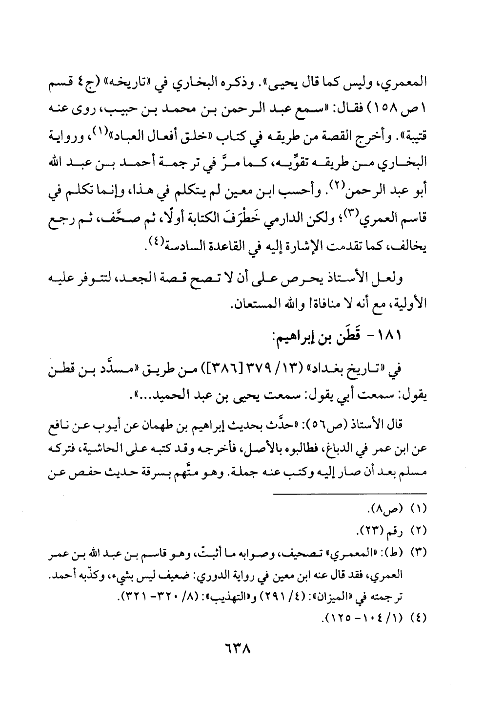 المعمري، وليس كما قال يحيى». وذكره البخاري في «تاريخه» (ج ٤ قسم ١ ص ١٥٨) فقال: «سمع عبد الرحمن بن محمد بن حبيب، روى عنه قتيبة». وأخرج القصة من طريقه في كتاب «خلق أفعال العباد» (¬١)، ورواية البخاري من طريقه تقوِّيه، كما مرَّ في ترجمة أحمد بن عبد الله أبو عبد الرحمن (¬٢). وأحسب ابن معين لم يتكلم في هذا، وإنما تكلم في قاسم العمري (¬٣)؛ ولكن الدارمي خَطْرَفَ الكتابة أولًا، ثم صحَّف، ثم رجع يخالف، كما تقدمت الإشارة إليه في القاعدة السادسة (¬٤).