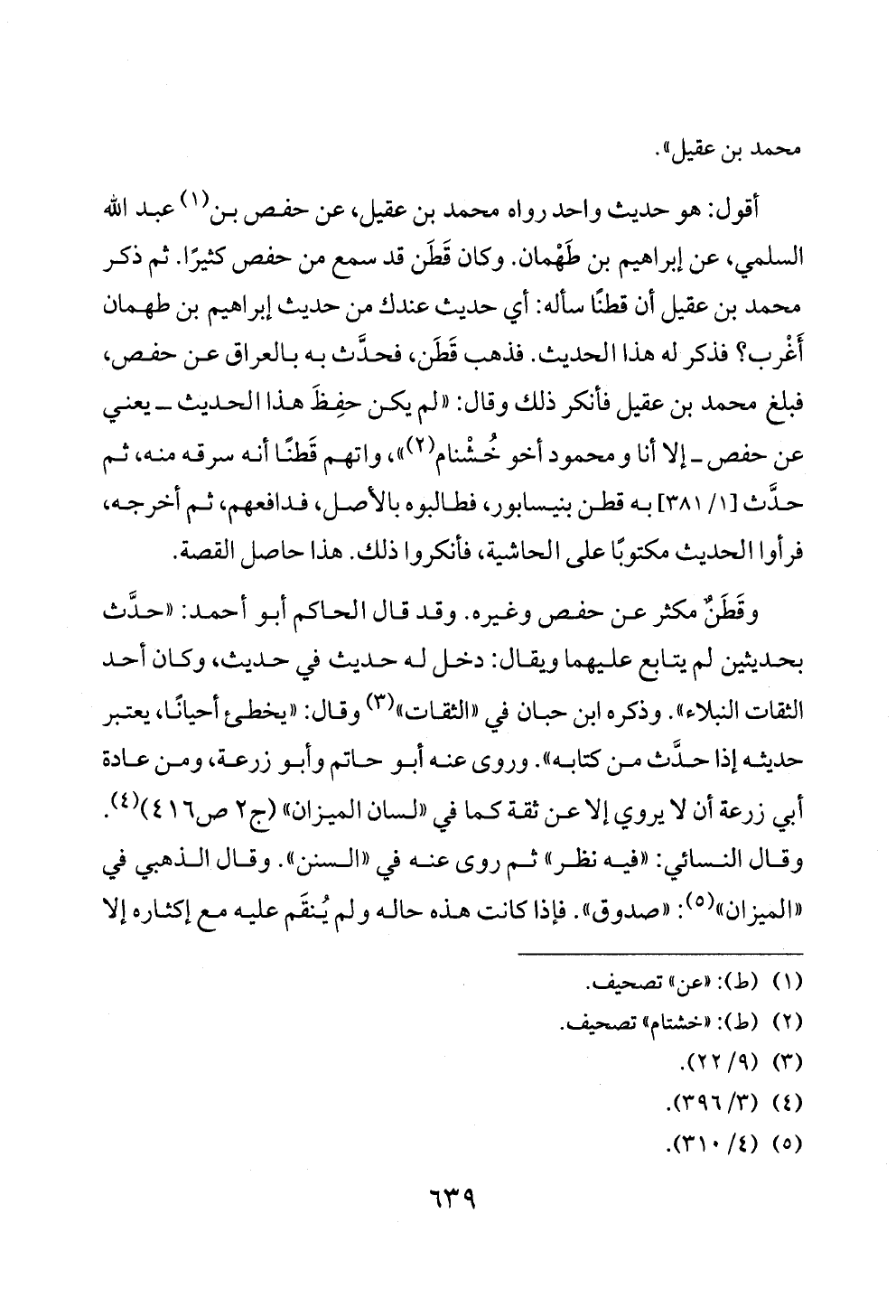 وقَطَنٌ مكثر عن حفص وغيره. وقد قال الحاكم أبو أحمد: «حدَّث بحديثين لم يتابع عليهما ويقال: دخل له حديث في حديث، وكان أحد الثقات النبلاء». وذكره ابن حبان في «الثقات» (¬٣) وقال: «يخطئ أحيانًا، يعتبر حديثه إذا حدَّث من كتابه». وروى عنه أبو حاتم وأبو زرعة، ومن عادة أبي زرعة أن لا يروي إلا عن ثقة كما في «لسان الميزان» (ج ٢ ص ٤١٦) (¬٤). وقال النسائي: «فيه نظر» ثم روى عنه في «السنن». وقال الذهبي في «الميزان» (¬٥): «صدوق». فإذا كانت هذه حاله ولم يُنقَم عليه مع إكثاره إلا