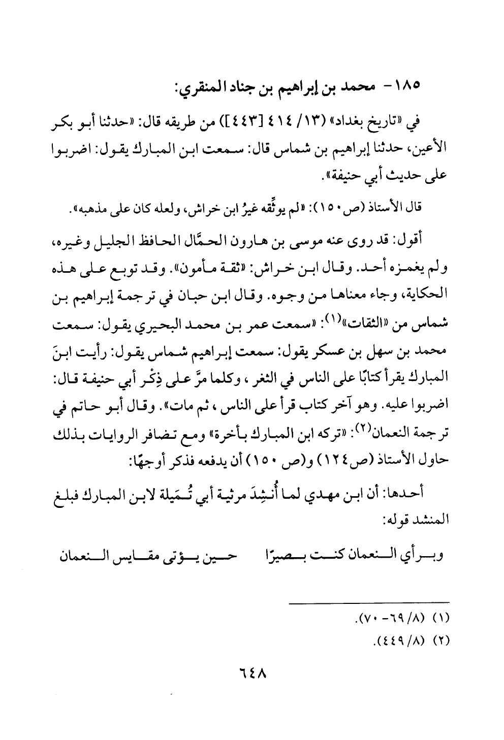 أقول: قد روى عنه موسى بن هارون الحمَّال الحافظ الجليل وغيره، ولم يغمزه أحد. وقال ابن خراش: «ثقة مأمون». وقد توبع على هذه الحكاية، وجاء معناها من وجوه. وقال ابن حبان في ترجمة إبراهيم بن شماس من «الثقات» (¬١): «سمعت عمر بن محمد البحيري يقول: سمعت محمد بن سهل بن عسكر يقول: سمعت إبراهيم شماس يقول: رأيت ابنَ المبارك يقرأ كتابًا على الناس في الثغر , وكلما مرَّ على ذِكْر أبي حنيفة قال: اضربوا عليه. وهو آخر كتاب قرأ على الناس , ثم مات». وقال أبو حاتم في ترجمة النعمان (¬٢): «تركه ابن المبارك بأخرة» ومع تضافر الروايات بذلك حاول الأستاذ (ص ١٢٤) و (ص ١٥٠) أن يدفعه فذكر أوجهًا: