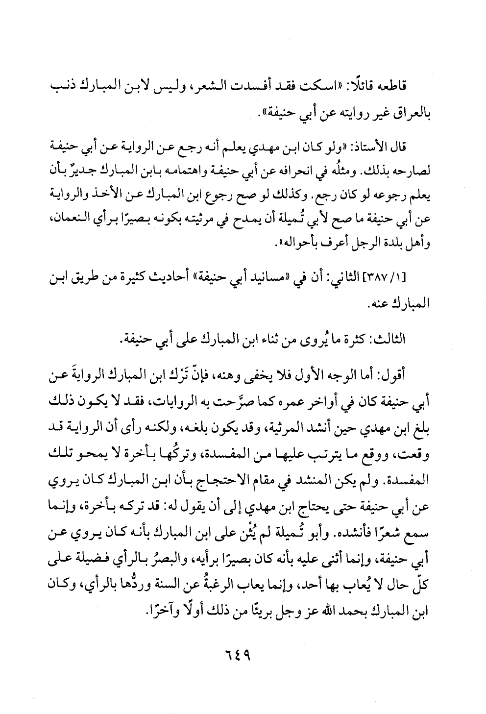 أقول: أما الوجه الأول فلا يخفى وهنه، فإنّ تَرْك ابن المبارك الروايةَ عن أبي حنيفة كان في أواخر عمره كما صرَّحت به الروايات، فقد لا يكون ذلك بلغ ابن مهدي حين أنشد المرثية، وقد يكون بلغه، ولكنه رأى أن الرواية قد وقعت، ووقع ما يترتب عليها من المفسدة، وتركُها بأخرة لا يمحو تلك المفسدة. ولم يكن المنشد في مقام الاحتجاج بأن ابن المبارك كان يروي عن أبي حنيفة حتى يحتاج ابن مهدي إلى أن يقول له: قد تركه بأخرة، وإنما سمع شعرًا فأنشده. وأبو تُميلة لم يُثْن على ابن المبارك بأنه كان يروي عن أبي حنيفة، وإنما أثنى عليه بأنه كان بصيرًا برأيه، والبصرُ بالرأي فضيلة على كلّ حال لا يُعاب بها أحد، وإنما يعاب الرغبةُ عن السنة وردُّها بالرأي، وكان ابن المبارك بحمد الله عز وجل بريئًا من ذلك أولًا وآخرًا.