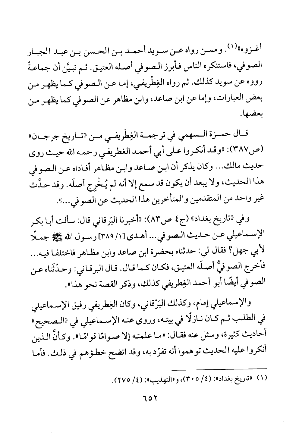 وفي «تاريخ بغداد» (ج ٤ ص ٨٣): «أخبرنا البَرقاني قال: سألت أبا بكر الإسماعيلي عن حديث الصوفي ... أهدى [١/ ٣٨٩] رسول الله - صلى الله عليه وسلم - جملًا لأبي جهل؟ فقال لي: حدثناه بحضرة ابن صاعد وابن مظاهر فاختلفا فيه ... فأخرج الصوفيُّ أصلَه العتيق، فكان كما قال. قال البرقاني: وحدّثَناه عن الصوفي أيضًا أبو أحمد الغِطريفي كذلك، وذكر القصة نحو هذا».