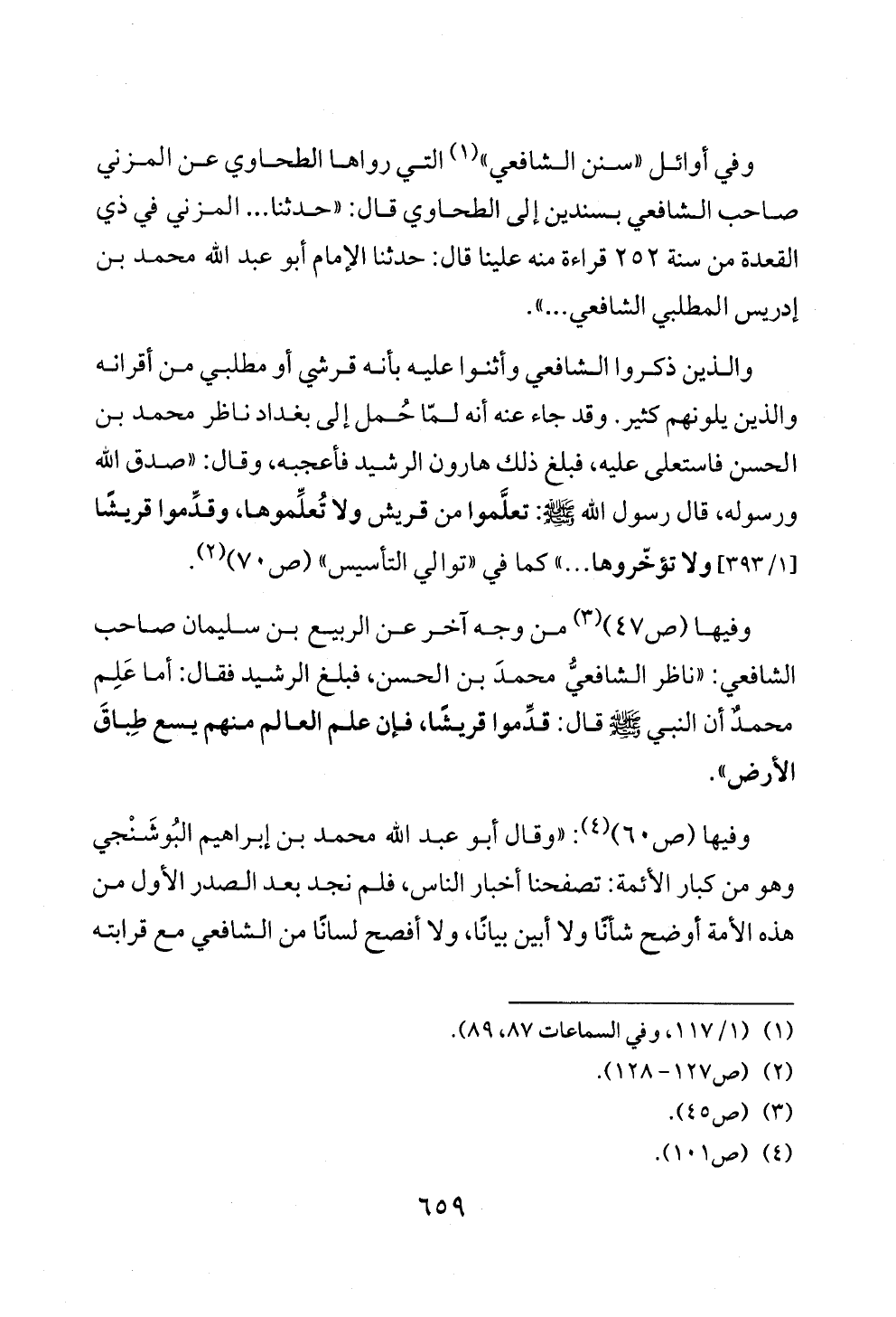 والذين ذكروا الشافعي وأثنوا عليه بأنه قرشي أو مطلبي من أقرانه والذين يلونهم كثير. وقد جاء عنه أنه لمّا حُمل إلى بغداد ناظر محمد بن الحسن فاستعلى عليه، فبلغ ذلك هارون الرشيد فأعجبه، وقال: «صدق الله ورسوله، قال رسول الله - صلى الله عليه وسلم -: تعلَّموا من قريش ولا تُعلِّموها، وقدِّموا قريشًا [١/ ٣٩٣] ولا تؤخّروها ... » كما في «توالي التأسيس» (ص ٧٠) (¬٢).