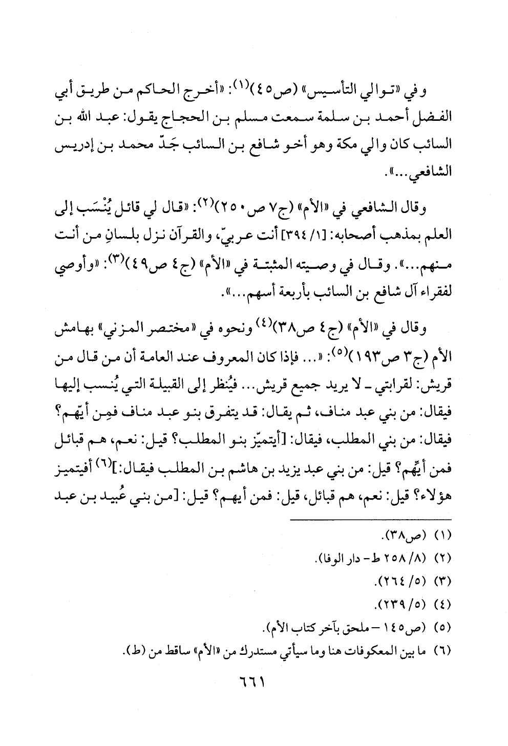 وقال الشافعي في «الأم» (ج ٧ ص ٢٥٠) (¬٢): «قال لي قائل يُنْسَب إلى العلم بمذهب أصحابه: [١/ ٣٩٤] أنت عربيّ، والقرآن نزل بلسانِ من أنت منهم ... ». وقال في وصيته المثبتة في «الأم» (ج ٤ ص ٤٩) (¬٣): «وأوصي لفقراء آل شافع بن السائب بأربعة أسهم ... ».