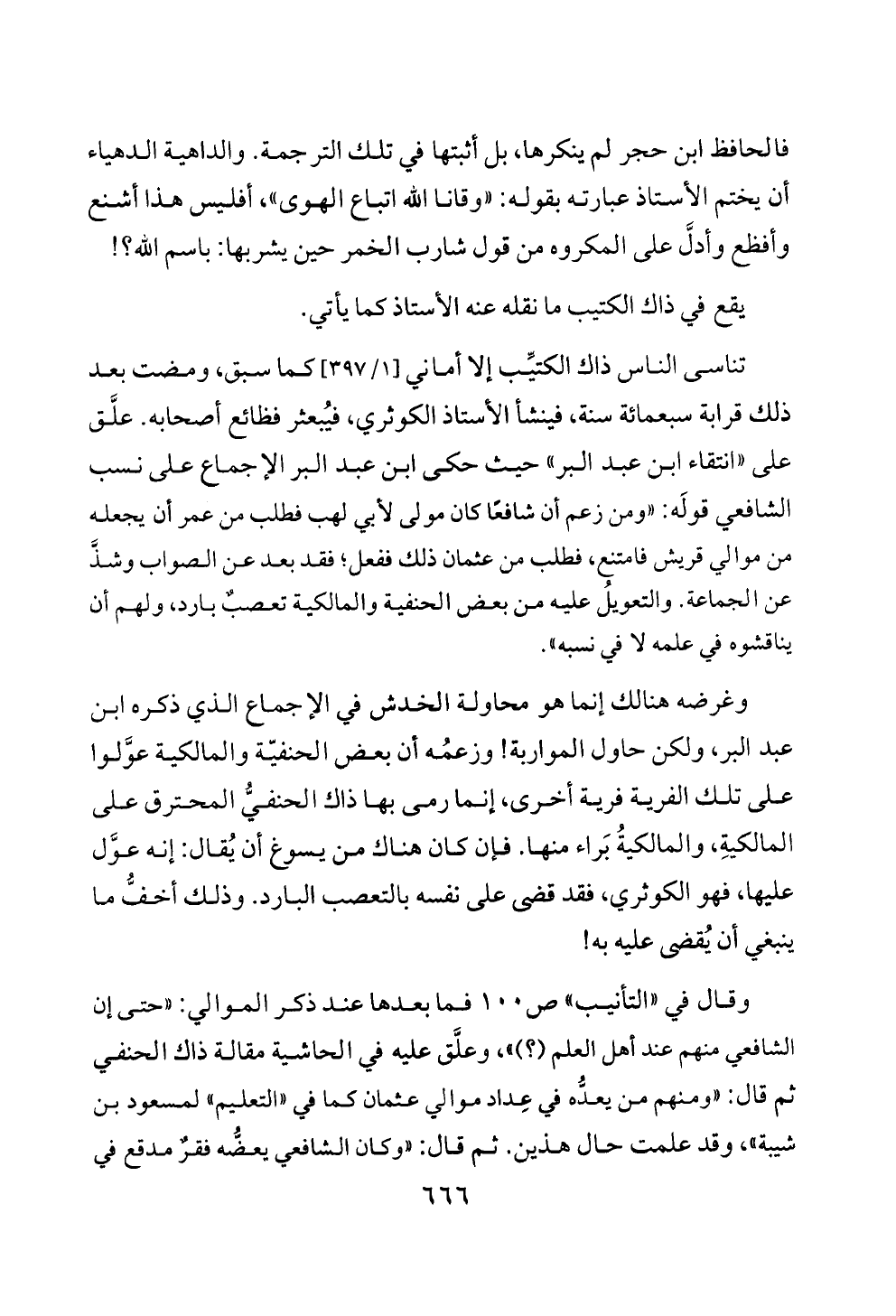 تناسى الناس ذاك الكتيِّب إلا أماني [١/ ٣٩٧] كما سبق، ومضت بعد ذلك قرابة سبعمائة سنة، فينشأ الأستاذ الكوثري، فيُبعثر فظائع أصحابه. علَّق على «انتقاء ابن عبد البر» حيث حكى ابن عبد البر الإجماع على نسب الشافعي قولَه: «ومن زعم أن شافعًا كان مولى لأبي لهب فطلب من عمر أن يجعله من موالي قريش فامتنع، فطلب من عثمان ذلك ففعل؛ فقد بعد عن الصواب وشذَّ عن الجماعة. والتعويلُ عليه من بعض الحنفية والمالكية تعصبٌ بارد، ولهم أن يناقشوه في علمه لا في نسبه».