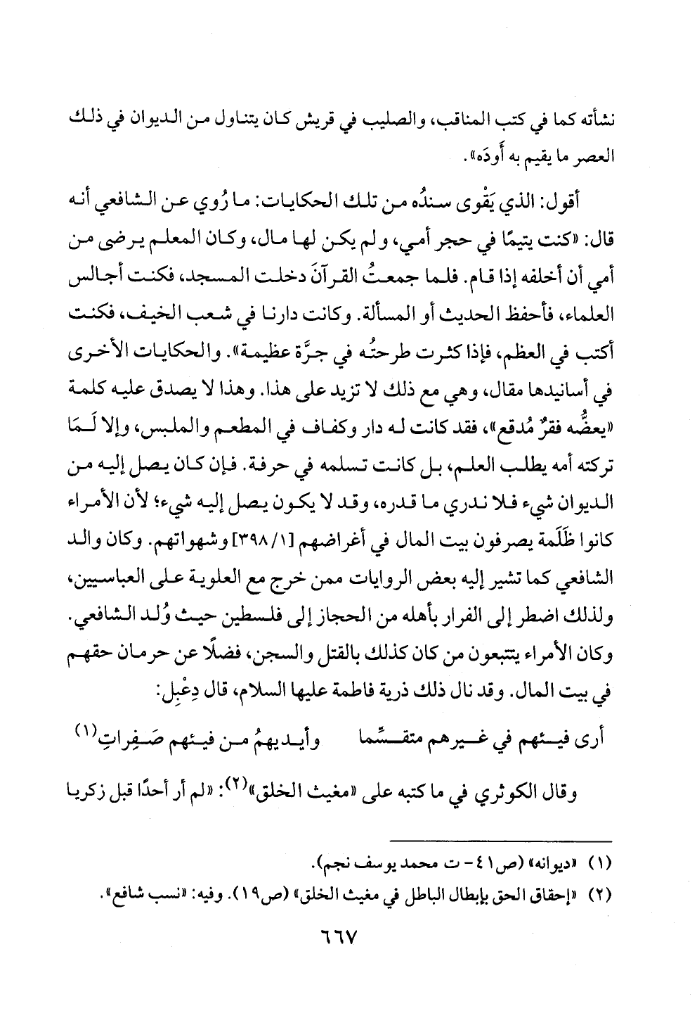 أقول: الذي يَقْوى سندُه من تلك الحكايات: ما رُوي عن الشافعي أنه قال: «كنت يتيمًا في حجر أمي، ولم يكن لها مال، وكان المعلم يرضى من أمي أن أخلفه إذا قام. فلما جمعتُ القرآنَ دخلت المسجد، فكنت أجالس العلماء، فأحفظ الحديث أو المسألة. وكانت دارنا في شعب الخيف، فكنت أكتب في العظم، فإذا كثرت طرحتُه في جرَّة عظيمة». والحكايات الأخرى في أسانيدها مقال، وهي مع ذلك لا تزيد على هذا. وهذا لا يصدق عليه كلمة «يعضُّه فقرٌ مُدقع»، فقد كانت له دار وكفاف في المطعم والملبس، وإلا لَمَا تركته أمه يطلب العلم، بل كانت تسلمه في حرفة. فإن كان يصل إليه من الديوان شيء فلا ندري ما قدره، وقد لا يكون يصل إليه شيء؛ لأن الأمراء كانوا ظَلَمة يصرفون بيت المال في أغراضهم [١/ ٣٩٨] وشهواتهم. وكان والد الشافعي كما تشير إليه بعض الروايات ممن خرج مع العلوية على العباسيين، ولذلك اضطر إلى الفرار بأهله من الحجاز إلى فلسطين حيث وُلد الشافعي. وكان الأمراء يتتبعون من كان كذلك بالقتل والسجن، فضلًا عن حرمان حقهم في بيت المال. وقد نال ذلك ذرية فاطمة عليها السلام، قال دِعْبِل: