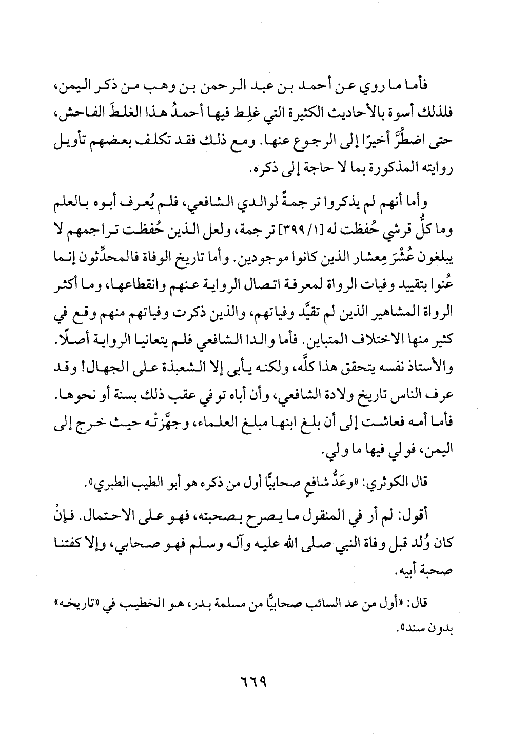 قال الكوثري: «وعَدُّ شافعٍ صحابيًّا أول من ذكره هو أبو الطيب الطبري».