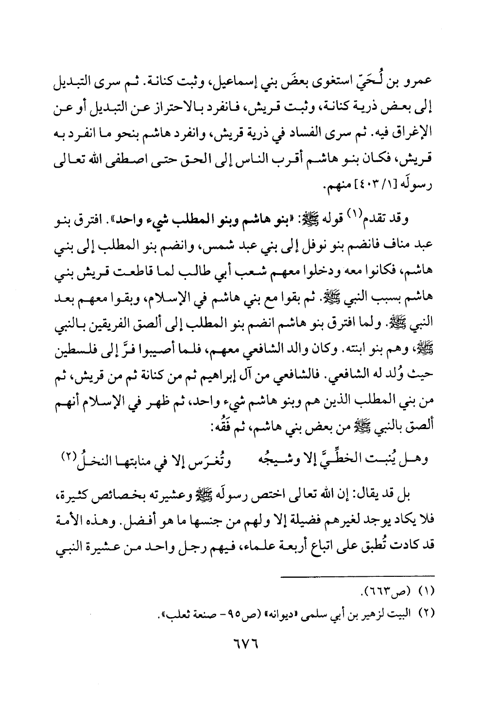 وقد تقدم (¬١) قوله - صلى الله عليه وسلم -: «بنو هاشم وبنو المطلب شيء واحد». افترق بنو عبد مناف فانضم بنو نوفل إلى بني عبد شمس، وانضم بنو المطلب إلى بني هاشم، فكانوا معه ودخلوا معهم شعب أبي طالب لما قاطعت قريش بني هاشم بسبب النبي - صلى الله عليه وسلم -. ثم بقوا مع بني هاشم في الإسلام، وبقوا معهم بعد النبي - صلى الله عليه وسلم -. ولما افترق بنو هاشم انضم بنو المطلب إلى ألصق الفريقين بالنبي - صلى الله عليه وسلم -، وهم بنو ابنته. وكان والد الشافعي معهم، فلما أصيبوا فرَّ إلى فلسطين حيث وُلد له الشافعي. فالشافعي من آل إبراهيم ثم من كنانة ثم من قريش، ثم من بني المطلب الذين هم وبنو هاشم شيء واحد، ثم ظهر في الإسلام أنهم ألصق بالنبي - صلى الله عليه وسلم - من بعض بني هاشم، ثم فَقُه: