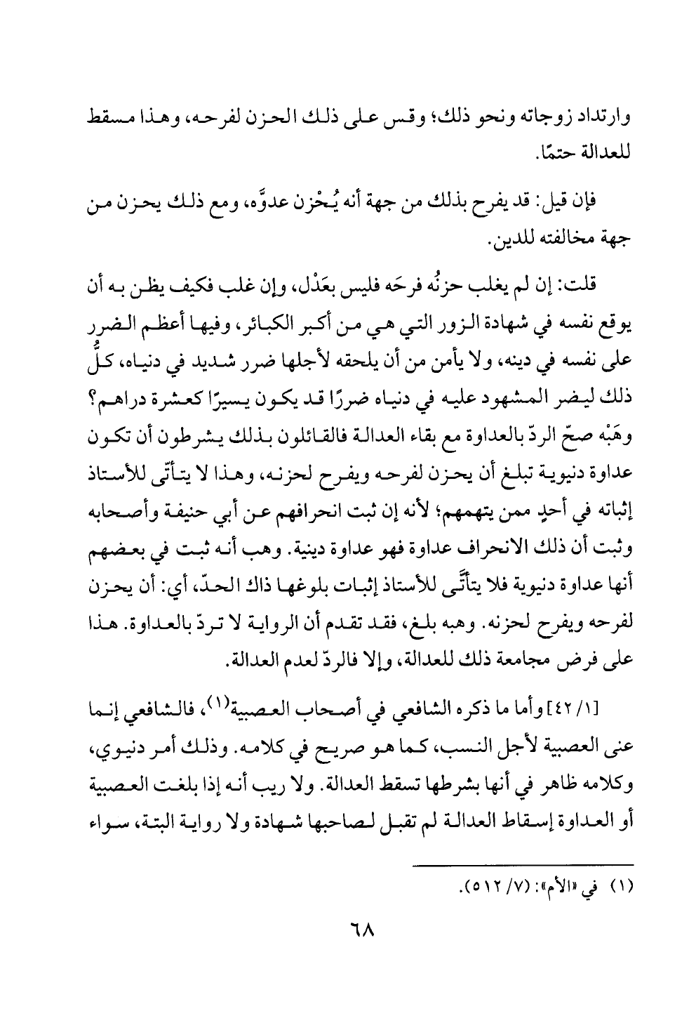 قلت: إن لم يغلب حزنُه فرحَه فليس بعَدْل، وإن غلب فكيف يظن به أن يوقع نفسه في شهادة الزور التي هي من أكبر الكبائر، وفيها أعظم الضرر على نفسه في دينه، ولا يأمن من أن يلحقه لأجلها ضرر شديد في دنياه، كلُّ ذلك ليضر المشهود عليه في دنياه ضررًا قد يكون يسيرًا كعشرة دراهم؟ وهَبْه صحّ الردّ بالعداوة مع بقاء العدالة فالقائلون بذلك يشرطون أن تكون عداوة دنيوية تبلغ أن يحزن لفرحه ويفرح لحزنه، وهذا لا يتأتّى للأستاذ إثباته في أحدٍ ممن يتهمهم؛ لأنه إن ثبت انحرافهم عن أبي حنيفة وأصحابه وثبت أن ذلك الانحراف عداوة فهو عداوة دينية. وهب أنه ثبت في بعضهم أنها عداوة دنيوية فلا يتأتَّى للأستاذ إثبات بلوغها ذاك الحدّ، أي: أن يحزن لفرحه ويفرح لحزنه. وهبه بلغ، فقد تقدم أن الرواية لا تردّ بالعداوة. هذا على فرض مجامعة ذلك للعدالة، وإلا فالردّ لعدم العدالة.