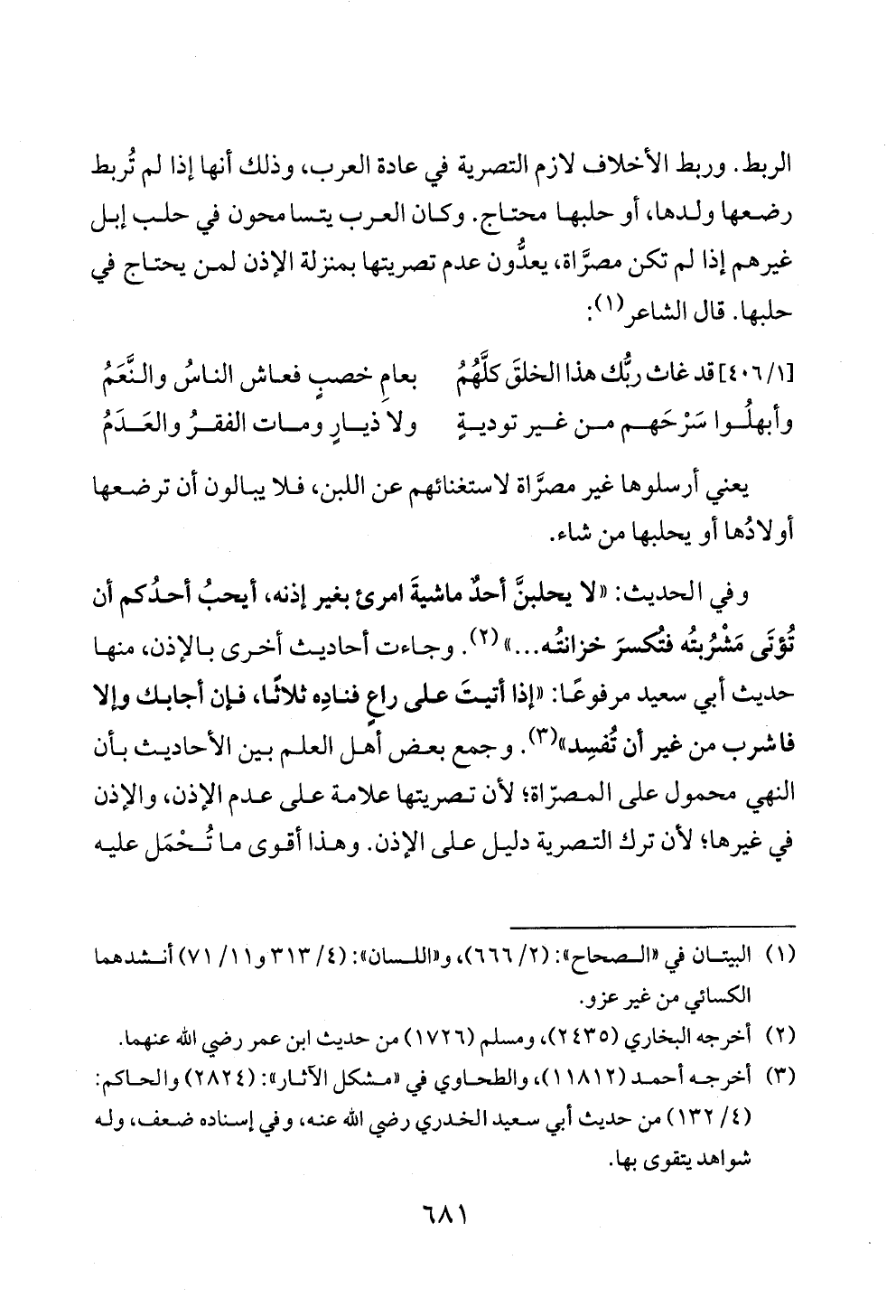 وفي الحديث: «لا يحلبنَّ أحدٌ ماشيةَ امرئ بغير إذنه، أيحبُ أحدُكم أن تُؤتَى مَشْرُبتُه فتُكسرَ خزانتُه ... » (¬٢). وجاءت أحاديث أخرى بالإذن، منها حديث أبي سعيد مرفوعًا: «إذا أتيتَ على راعٍ فنادِه ثلاثًا، فإن أجابك وإلا فاشرب من غير أن تُفسِد» (¬٣). وجمع بعض أهل العلم بين الأحاديث بأن النهي محمول على المصرّاة؛ لأن تصريتها علامة على عدم الإذن، والإذن في غيرها؛ لأن ترك التصرية دليل على الإذن. وهذا أقوى ما تُحْمَل عليه