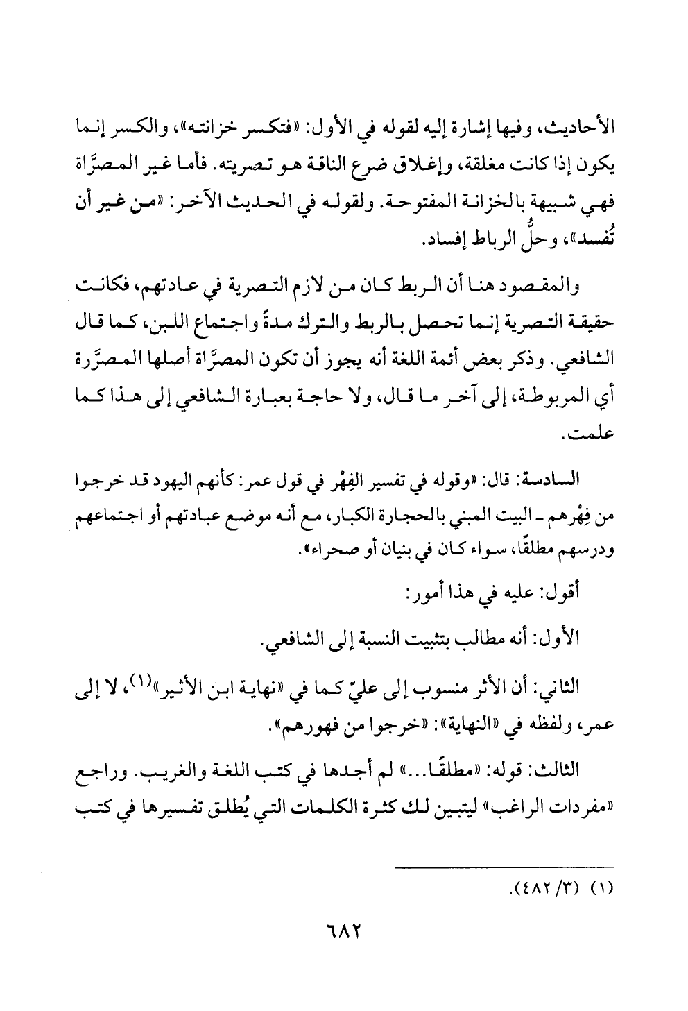 والمقصود هنا أن الربط كان من لازم التصرية في عادتهم، فكانت حقيقة التصرية إنما تحصل بالربط والترك مدةً واجتماع اللبن، كما قال الشافعي. وذكر بعض أئمة اللغة أنه يجوز أن تكون المصرَّاة أصلها المصرَّرة أي المربوطة، إلى آخر ما قال، ولا حاجة بعبارة الشافعي إلى هذا كما علمت.