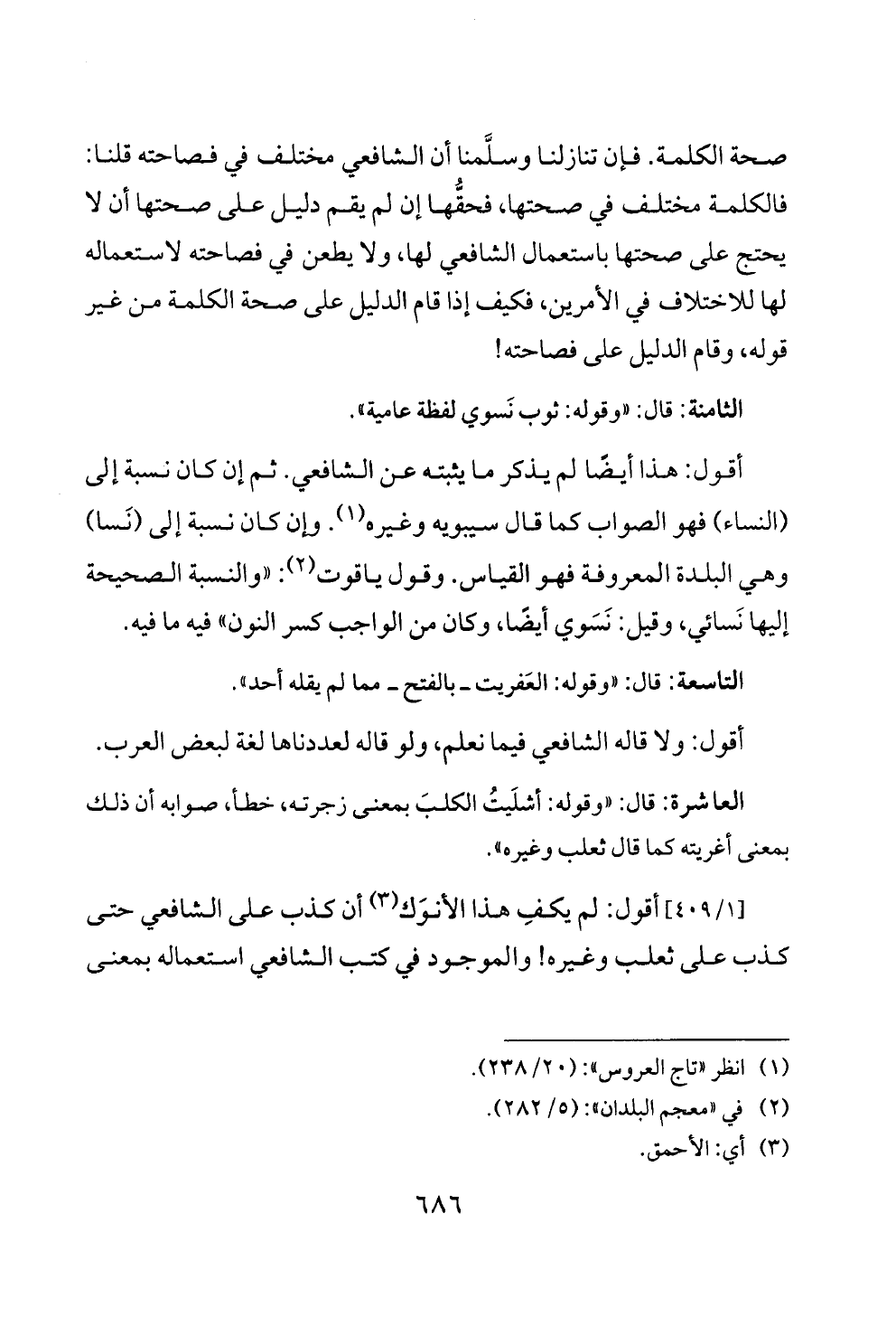 أقول: هذا أيضًا لم يذكر ما يثبته عن الشافعي. ثم إن كان نسبة إلى (النساء) فهو الصواب كما قال سيبويه وغيره (¬١). وإن كان نسبة إلى (نَسا) وهي البلدة المعروفة فهو القياس. وقول ياقوت (¬٢): «والنسبة الصحيحة إليها نَسائي، وقيل: نَسَوي أيضًا، وكان من الواجب كسر النون» فيه ما فيه.