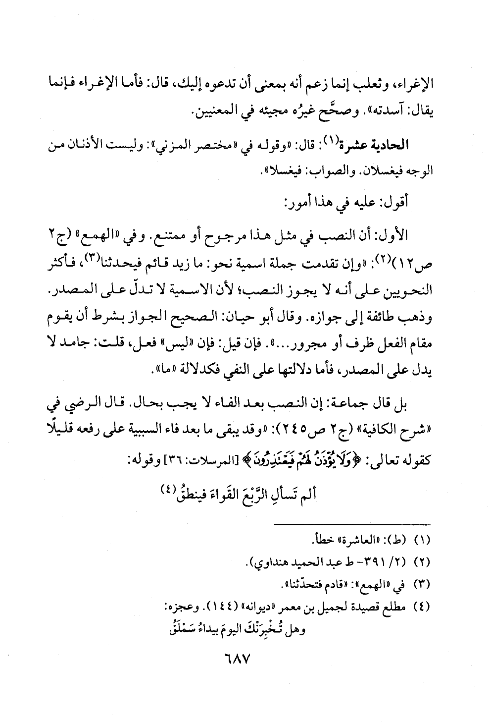 الأول: أن النصب في مثل هذا مرجوح أو ممتنع. وفي «الهمع» (ج ٢ ص ١٢) (¬٢): «وإن تقدمت جملة اسمية نحو: ما زيد قائم فيحدثنا (¬٣)، فأكثر النحويين على أنه لا يجوز النصب؛ لأن الاسمية لا تدلّ على المصدر. وذهب طائفة إلى جوازه. وقال أبو حيان: الصحيح الجواز بشرط أن يقوم مقام الفعل ظرف أو مجرور ... ». فإن قيل: فإن «ليس» فعل، قلت: جامد لا يدل على المصدر، فأما دلالتها على النفي فكدلالة «ما».