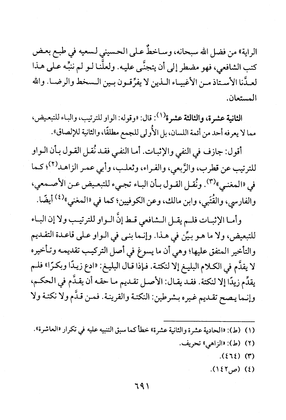 الثانية عشرة، والثالثة عشرة (¬١): قال: «وقوله: الواو للترتيب، والباء للتبعيض، مما لا يعرفه أحد من أئمة اللسان، بل الأُولى للجمع مطلقًا، والثانية للإلصاق».
