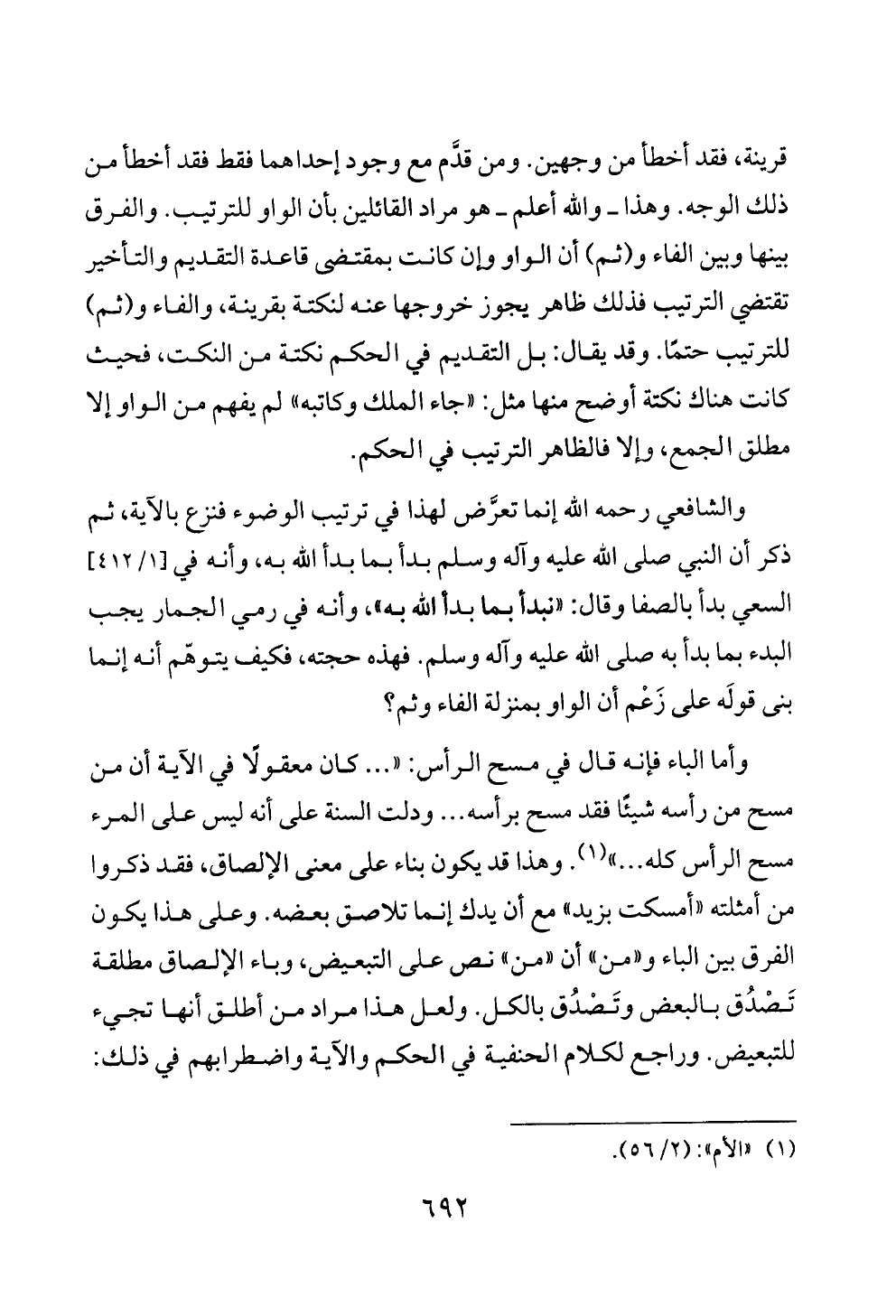 والشافعي رحمه الله إنما تعرَّض لهذا في ترتيب الوضوء فنزع بالآية، ثم ذكر أن النبي صلى الله عليه وآله وسلم بدأ بما بدأ الله به، وأنه في [١/ ٤١٢] السعي بدأ بالصفا وقال: «نبدأ بما بدأ الله به»، وأنه في رمي الجمار يجب البدء بما بدأ به صلى الله عليه وآله وسلم. فهذه حجته، فكيف يتوهّم أنه إنما بنى قولَه على زَعْم أن الواو بمنزلة الفاء وثم؟