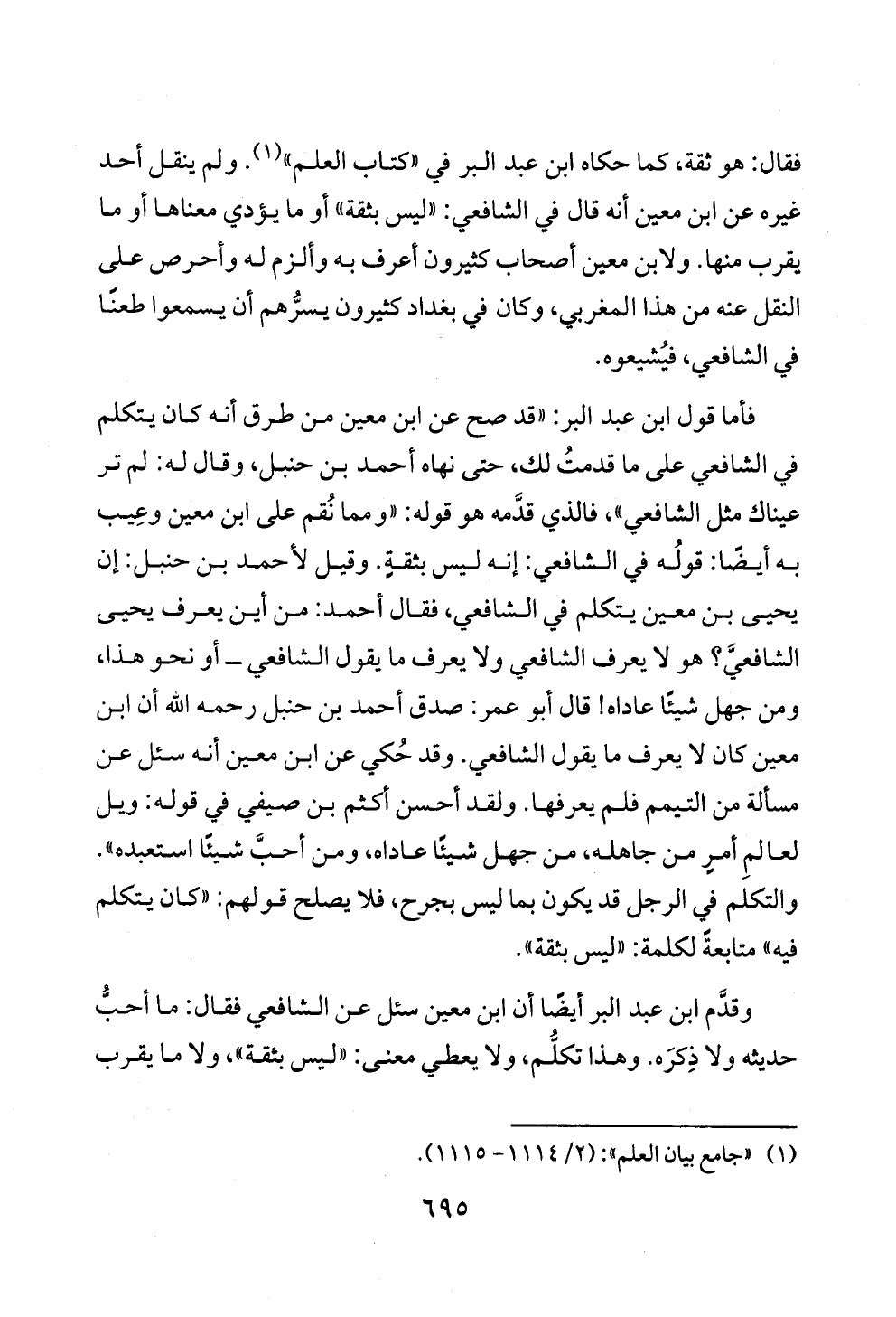 وقدَّم ابن عبد البر أيضًا أن ابن معين سئل عن الشافعي فقال: ما أحبُّ حديثه ولا ذِكرَه. وهذا تكلُّم، ولا يعطي معنى: «ليس بثقة»، ولا ما يقرب