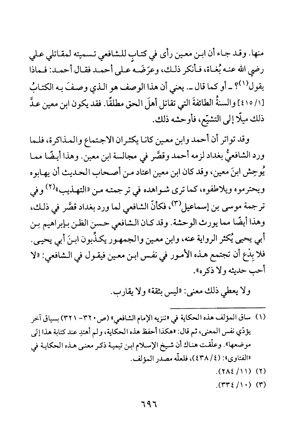 منها. وقد جاء أن ابن معين رأى في كتابٍ للشافعي تسميته لمقاتلي علي رضي الله عنه بُغاة، فأنكر ذلك، وعرَضَه على أحمد فقال أحمد: فماذا يقول (¬١)؟ ــ أو كما قال ــ. يعني أن هذا الوصف هو الذي وصفَ به الكتابُ [١/ ٤١٥] والسنةُ الطائفةَ التي تقاتل أهلَ الحق مطلقًا. فقد يكون ابن معين عدَّ ذلك ميلًا إلى التشيّع، فأوحشه ذلك.