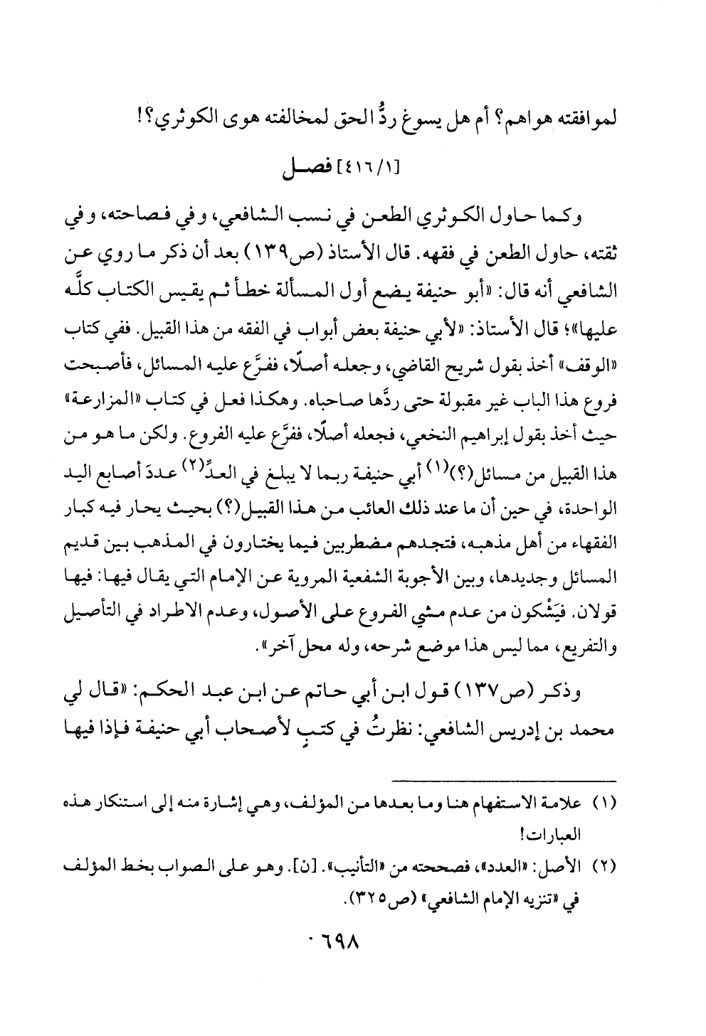 وكما حاول الكوثري الطعن في نسب الشافعي، وفي فصاحته، وفي ثقته، حاول الطعن في فقهه. قال الأستاذ (ص ١٣٩) بعد أن ذكر ما روي عن الشافعي أنه قال: «أبو حنيفة يضع أول المسألة خطأ ثم يقيس الكتاب كلَّه عليها»؛ قال الأستاذ: «لأبي حنيفة بعض أبواب في الفقه من هذا القبيل. ففي كتاب «الوقف» أخذ بقول شريح القاضي، وجعله أصلًا، ففرَّع عليه المسائل، فأصبحت فروع هذا الباب غير مقبولة حتى ردَّها صاحباه. وهكذا فعل في كتاب «المزارعة» حيث أخذ بقول إبراهيم النخعي، فجعله أصلًا، ففرَّع عليه الفروع. ولكن ما هو من هذا القبيل من مسائل (؟) (¬١) أبي حنيفة ربما لا يبلغ في العدِّ (¬٢) عددَ أصابع اليد الواحدة، في حين أن ما عند ذلك العائب من هذا القبيل (؟) بحيث يحار فيه كبار الفقهاء من أهل مذهبه، فتجدهم مضطربين فيما يختارون في المذهب بين قديم المسائل وجديدها، وبين الأجوبة الشفعية المروية عن الإمام التي يقال فيها: فيها قولان. فيَشْكون من عدم مشي الفروع على الأصول، وعدم الاطراد في التأصيل والتفريع، مما ليس هذا موضع شرحه، وله محل آخر».