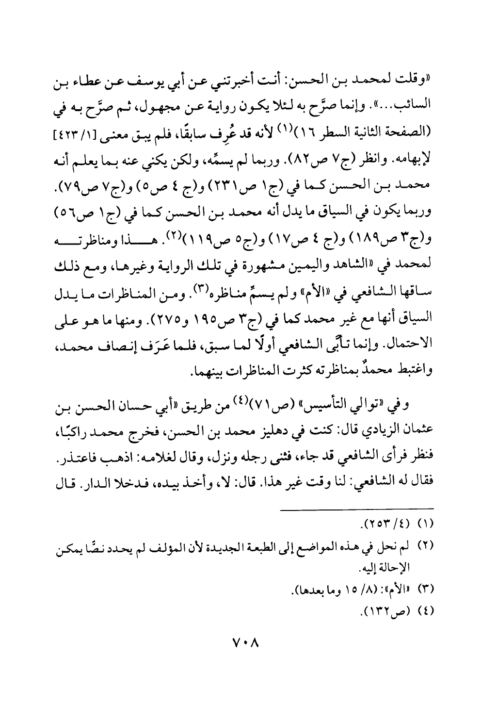 «وقلت لمحمد بن الحسن: أنت أخبرتني عن أبي يوسف عن عطاء بن السائب ... ». وإنما صرَّح به لئلا يكون رواية عن مجهول، ثم صرَّح به في (الصفحة الثانية السطر ١٦) (¬١) لأنه قد عُرِف سابقًا، فلم يبق معنى [١/ ٤٢٣] لإبهامه. وانظر (ج ٧ ص ٨٢). وربما لم يسمِّه، ولكن يكني عنه بما يعلم أنه محمد بن الحسن كما في (ج ١ ص ٢٣١) و (ج ٤ ص ٥) و (ج ٧ ص ٧٩). وربما يكون في السياق ما يدل أنه محمد بن الحسن كما في (ج ١ ص ٥٦) و (ج ٣ ص ١٨٩) و (ج ٤ ص ١٧) و (ج ٥ ص ١١٩) (¬٢). هذا ومناظرته لمحمد في «الشاهد واليمين مشهورة في تلك الرواية وغيرها، ومع ذلك ساقها الشافعي في «الأم» ولم يسمِّ مناظره (¬٣). ومن المناظرات ما يدل السياق أنها مع غير محمد كما في (ج ٣ ص ١٩٥ و ٢٧٥). ومنها ما هو على الاحتمال. وإنما تأبَّى الشافعي أولًا لما سبق، فلما عَرَف إنصاف محمد، واغتبط محمدٌ بمناظرته كثرت المناظرات بينهما.
