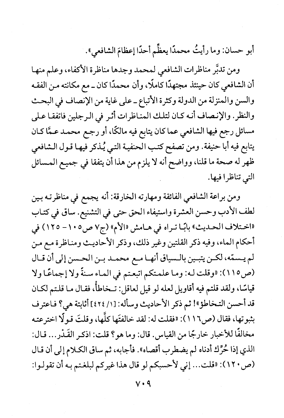 ومن براعة الشافعي الفائقة ومهارته الخارقة: أنه يجمع في مناظرته بين لطف الأدب وحسن العشرة واستيفاء الحق حتى في التشنيع. ساق في كتاب «اختلاف الحديث» بابًا تراه في هامش «الأم» (ج ٧ ص ١٠٥ - ١٢٥) في أحكام الماء، وفيه ذكر القلتين وغير ذلك، وذكر الأحاديث ومناظرة مع من لم يسمّه، لكن يتبين بالسياق أنها مع محمد بن الحسن إلى أن قال (ص ١١٥): «وقلت له: وما علمتكم اتبعتم في الماء سنةً ولا إجماعًا ولا قياسًا، ولقد قلتم فيه أقاويل لعله لو قيل لعاقل: تخاطأْ، فقال ما قلتم لكان قد أحسن التخاطؤ»! ثم ذكر الأحاديث وسأله: [١/ ٤٢٤] أثابتة هي؟ فاعترف بثبوتها، فقال (ص ١١٦): «فقلت له: لقد خالفتَها كلَّها، وقلتَ قولًا اخترعته مخالفًا للأخبار خارجًا من القياس. قال: وما هو؟ قلت: اذكر القَدْر ... قال: الذي إذا حُرِّك أدناه لم يضطرب أقصاه». فأجابه، ثم ساق الكلام إلى أن قال (ص ١٢٠): «قلت ... إني لأحسبكم لو قال هذا غيركم لبلغتم به أن تقولوا: