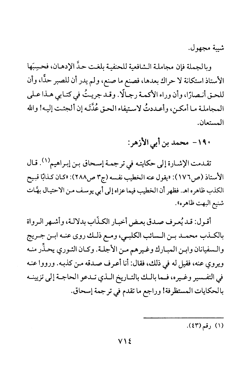 أقول: قد يُعرف صدق بعض أخبار الكذّاب بدلالة، وأشهر الرواة بالكذب محمد بن السائب الكلبي، ومع ذلك روى عنه ابن جريج والسفيانان وابن المبارك وغيرهم من الأجلة. وكان الثوري يحذِّر منه ويروي عنه، فقيل له في ذلك، فقال: أنا أعرف صدقه من كذبه. ورووا عنه في التفسير وغيره، فما بالك بالتاريخ الذي تدعو الحاجة إلى تزيينه بالحكايات المستظرفة! وراجع ما تقدم في ترجمة إسحاق.