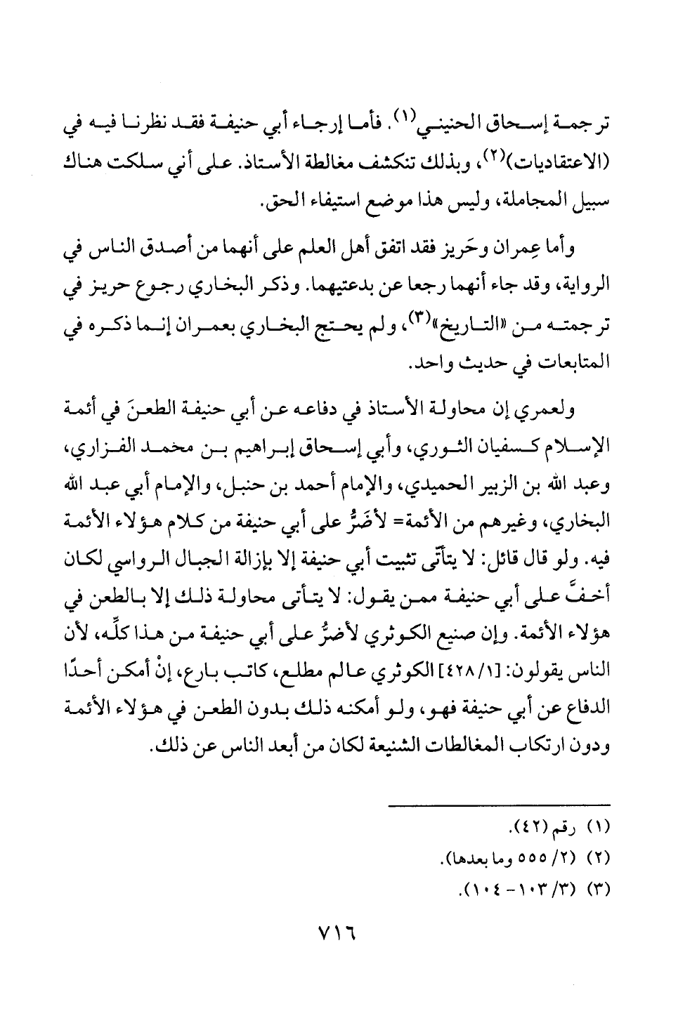 ترجمة إسحاق الحنيني (¬١). فأما إرجاء أبي حنيفة فقد نظرنا فيه في (الاعتقاديات) (¬٢)، وبذلك تنكشف مغالطة الأستاذ. على أني سلكت هناك سبيل المجاملة، وليس هذا موضع استيفاء الحق.