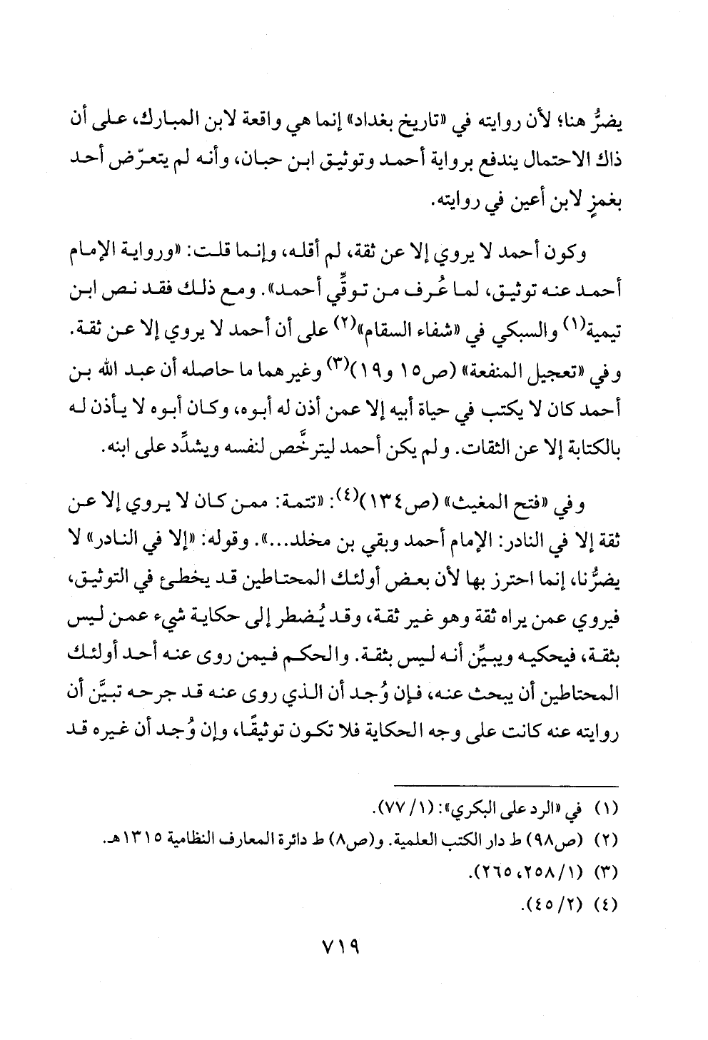 وكون أحمد لا يروي إلا عن ثقة، لم أقله، وإنما قلت: «ورواية الإمام أحمد عنه توثيق، لما عُرف من توقِّي أحمد». ومع ذلك فقد نص ابن تيمية (¬١) والسبكي في «شفاء السقام» (¬٢) على أن أحمد لا يروي إلا عن ثقة. وفي «تعجيل المنفعة» (ص ١٥ و ١٩) (¬٣) وغيرهما ما حاصله أن عبد الله بن أحمد كان لا يكتب في حياة أبيه إلا عمن أذن له أبوه، وكان أبوه لا يأذن له بالكتابة إلا عن الثقات. ولم يكن أحمد ليترخَّص لنفسه ويشدِّد على ابنه.