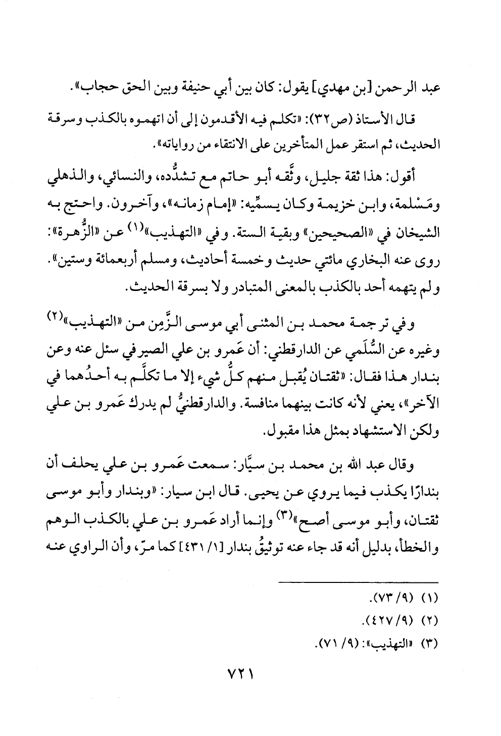 وفي ترجمة محمد بن المثنى أبي موسى الزَّمِن من «التهذيب» (¬٢) وغيره عن السُّلَمي عن الدارقطني: أن عَمرو بن علي الصيرفي سئل عنه وعن بندار هذا فقال: «ثقتان يُقبل منهم كلُّ شيء إلا ما تكلَّم به أحدُهما في الآخر»، يعني لأنه كانت بينهما منافسة. والدارقطنيُّ لم يدرك عَمرو بن علي ولكن الاستشهاد بمثل هذا مقبول.
